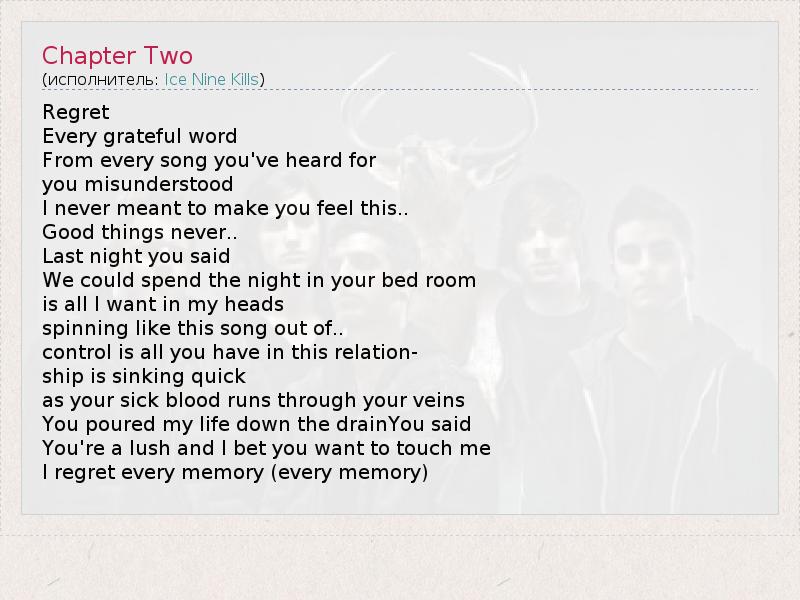 Regret Every grateful word From every song you've heard for you misunderstood I never meant to make you feel this.. Good things never.. Last night you said We could spend the night in your bed room is all I want in my heads spinning like this song out of.. control is all you have in this relation- ship is sinking quick as your sick blood runs through your veins You poured my life down the drainYou said You're a lush and I bet you want to touch me I regret every memory (every memory)