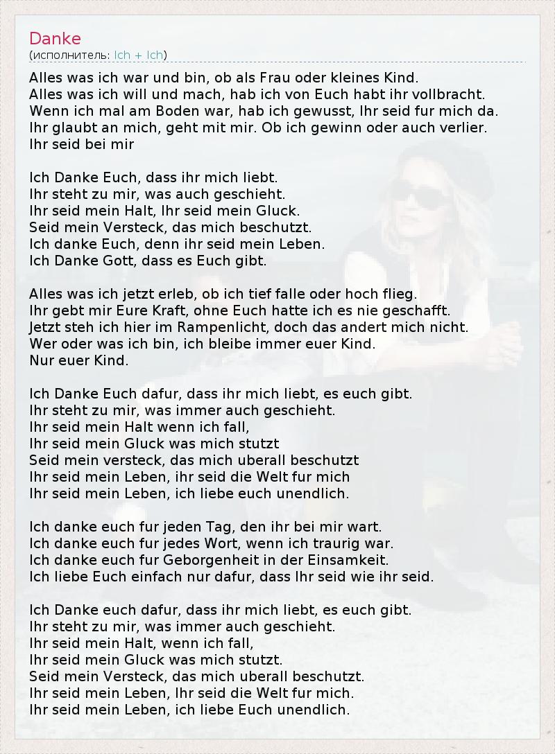 Alles was ich war und bin, ob als Frau oder kleines Kind. Alles was ich will und mach, hab ich von Euch habt ihr vollbracht. Wenn ich mal am Boden war, hab ich gewusst, Ihr seid fur mich da. Ihr glaubt an mich, geht mit mir. Ob ich gewinn oder auch verlier. Ihr seid bei mir Ich Danke Euch, dass ihr mich liebt. Ihr steht zu mir, was auch geschieht. Ihr seid mein Halt, Ihr seid mein Gluck. Seid mein Versteck, das mich beschutzt. Ich danke Euch, denn ihr seid mein Leben. Ich Danke Gott, dass es Euch gibt. Alles was ich jetzt erleb, ob ich tief falle oder hoch flieg. Ihr gebt mir Eure Kraft, ohne Euch hatte ich еs nie geschafft. Jetzt steh ich hier im Rampenlicht, doch das andert mich nicht. Wer oder was ich bin, ich bleibe immer euer Kind. Nur euer Kind. Ich Danke Euch dafur, dass ihr mich liebt, es euch gibt. Ihr steht zu mir, was immer auch geschieht. Ihr seid mein Halt wenn ich fall, Ihr seid mein Gluck was mich stutzt Seid mein versteck, das mich uberall beschutzt Ihr seid mein Leben, ihr seid die Welt fur mich Ihr seid mein Leben, ich liebe euch unendlich. Ich danke euch fur jeden Tag, den ihr bei mir wart. Ich danke euch fur jedes Wort, wenn ich traurig war. Ich danke euch fur Geborgenheit in der Einsamkeit. Ich liebe Euch einfach nur dafur, dass Ihr seid wie ihr seid. Ich Danke euch dafur, dass ihr mich liebt, es euch gibt. Ihr steht zu mir, was immer auch geschieht. Ihr seid mein Halt, wenn ich fall, Ihr seid mein Gluck was mich stutzt. Seid mein Versteck, das mich uberall beschutzt. Ihr seid mein Leben, Ihr seid die Welt fur mich. Ihr seid mein Leben, ich liebe Euch unendlich.