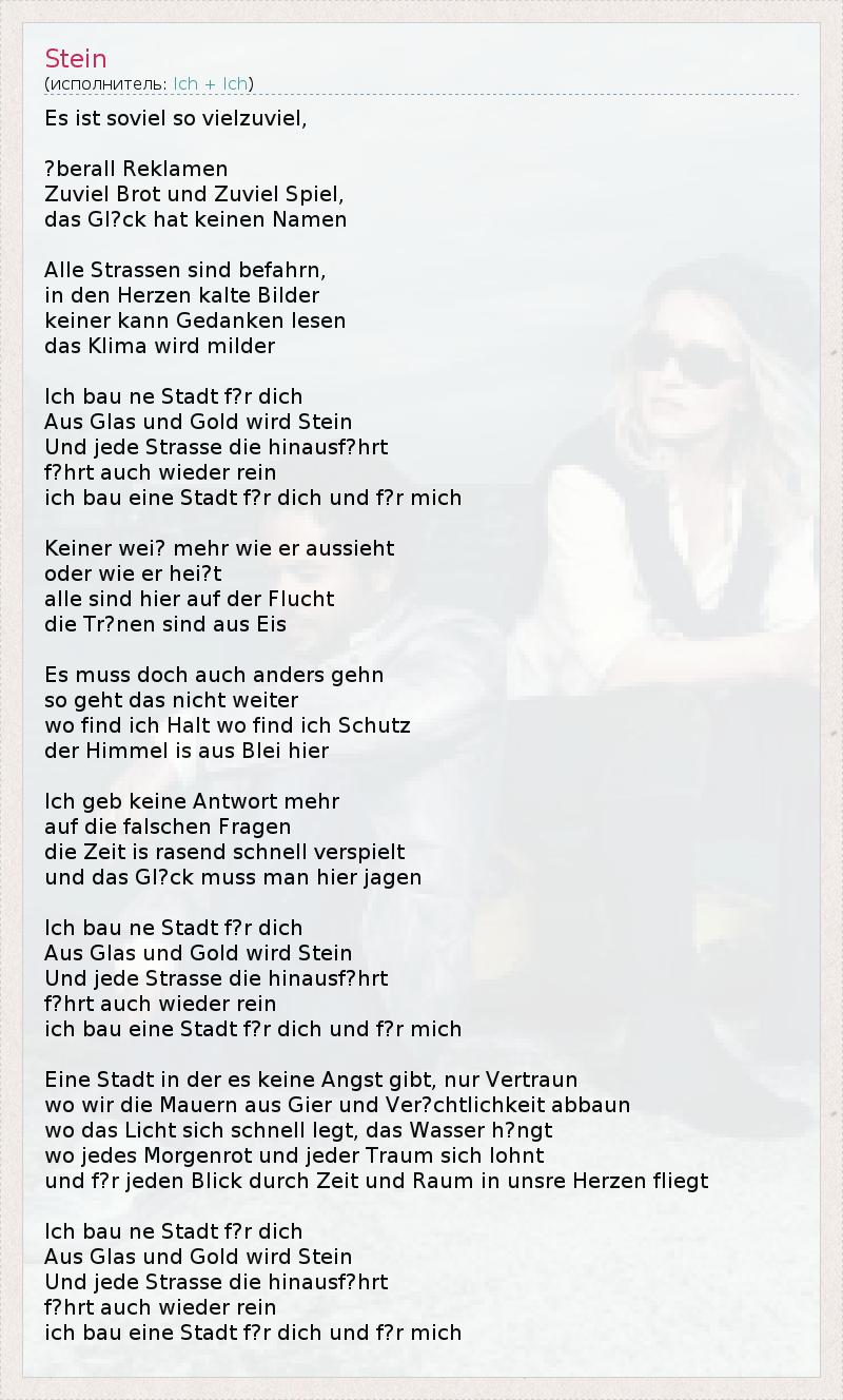 Это интересно:Ich + Ich (нем. "Я + Я") — немецкая поп-группа, основаная Аннеттой Хумпе и Аделем Тавилем. Они познакомились весной 2002 случайно в студии звукозаписи в Берлине. 18 апреля 2005 вышел их первый сингл «Geht’s dir schon besser?». Песни «Du erinnerst mich an Liebe» и «Dienen» попали в лучшую десятку Германии.