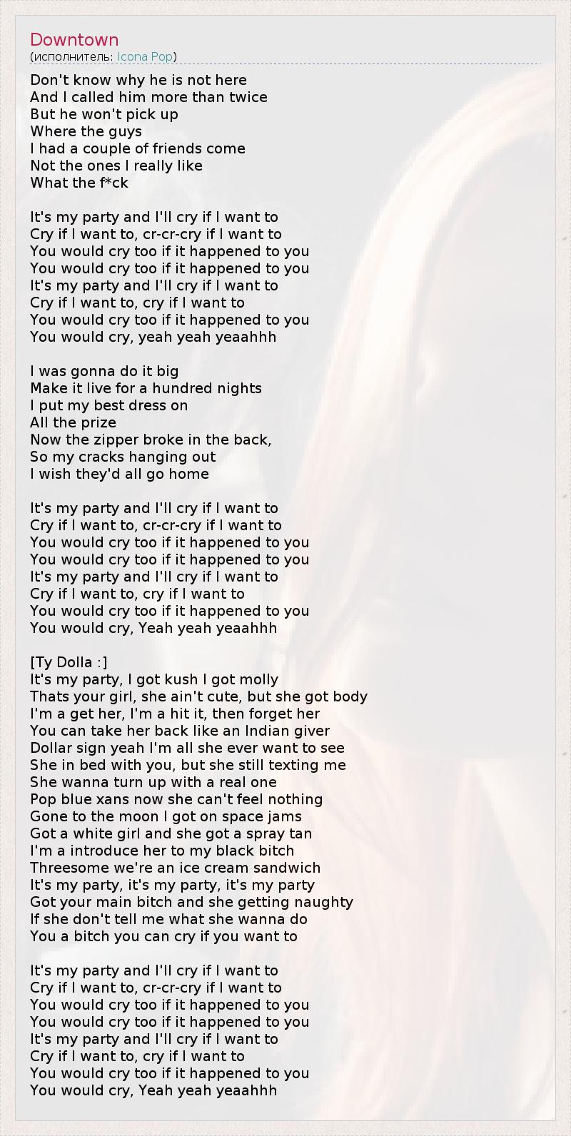 Don't know why he is not here And I called him more than twice But he won't pick up Where the guys I had a couple of friends come Not the ones I really like What the f*ck It's my party and I'll cry if I want to Cry if I want to, cr-cr-cry if I want to You would cry too if it happened to you You would cry too if it happened to you It's my party and I'll cry if I want to Cry if I want to, cry if I want to You would cry too if it happened to you You would cry, yeah yeah yeaahhh I was gonna do it big Make it live for a hundred nights I put my best dress on All the prize Now the zipper broke in the back, So my cracks hanging out I wish they'd all go home It's my party and I'll cry if I want to Cry if I want to, cr-cr-cry if I want to You would cry too if it happened to you You would cry too if it happened to you It's my party and I'll cry if I want to Cry if I want to, cry if I want to You would cry too if it happened to you You would cry, Yeah yeah yeaahhh [Ty Dolla :] It's my party, I got kush I got molly Thats your girl, she ain't cute, but she got body I'm a get her, I'm a hit it, then forget her You can take her back like an Indian giver Dollar sign yeah I'm all she ever want to see She in bed with you, but she still texting me She wanna turn up with a real one Pop blue xans now she can't feel nothing Gone to the moon I got on space jams Got a white girl and she got a spray tan I'm a introduce her to my black bitch Threesome we're an ice cream sandwich It's my party, it's my party, it's my party Got your main bitch and she getting naughty If she don't tell me what she wanna do You a bitch you can cry if you want to It's my party and I'll cry if I want to Cry if I want to, cr-cr-cry if I want to You would cry too if it happened to you You would cry too if it happened to you It's my party and I'll cry if I want to Cry if I want to, cry if I want to You would cry too if it happened to you You would cry, Yeah yeah yeaahhh