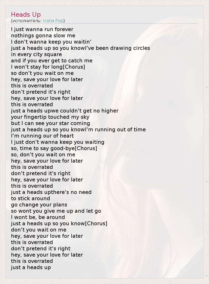 I just wanna run forever nothings gonna slow me I don't wanna keep you waitin' just a heads up so you knowI've been drawing circles in every city square and if you ever get to catch me I won't stay for long[Chorus] so don't you wait on me hey, save your love for later this is overrated don't pretend it's right hey, save your love for later this is overrated just a heads upwe couldn't get no higher your fingertip touched my sky but I can see your star coming just a heads up so you knowI'm running out of time I'm running our of heart I just don't wanna keep you waiting so, time to say good-bye[Chorus] so, don't you wait on me hey, save your love for later this is overrated don't pretend it's right hey, save your love for later this is overrated just a heads upthere's no need to stick around go change your plans so wont you give me up and let go I wont be, be around just a heads up so you know[Chorus] don't you wait on me hey, save your love for later this is overrated don't pretend it's right hey, save your love for later this is overrated just a heads up