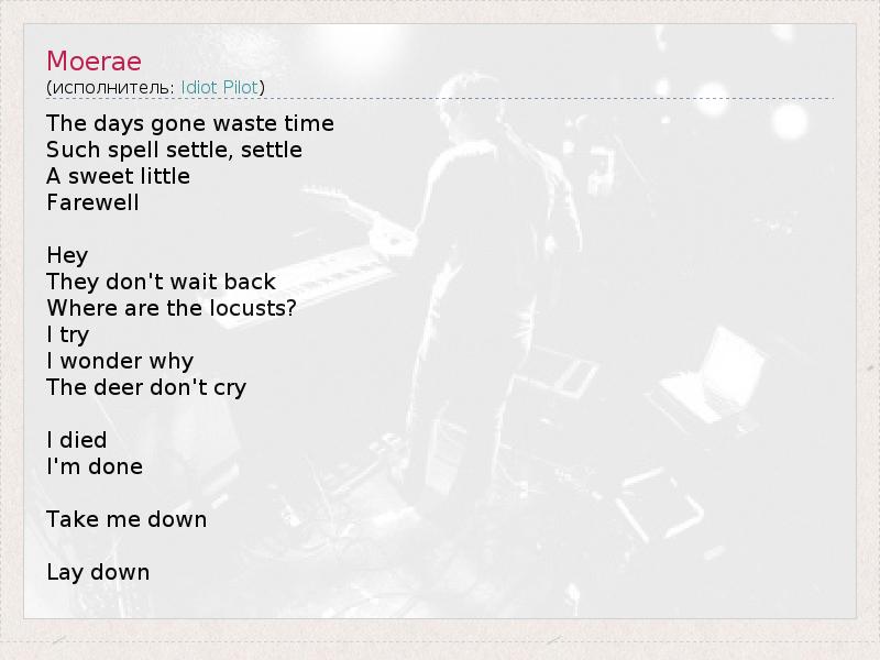 The days gone waste time Such spell settle, settle A sweet little Farewell Hey They don't wait back Where are the locusts? I try I wonder why The deer don't cry I died I'm done Take me down Lay down