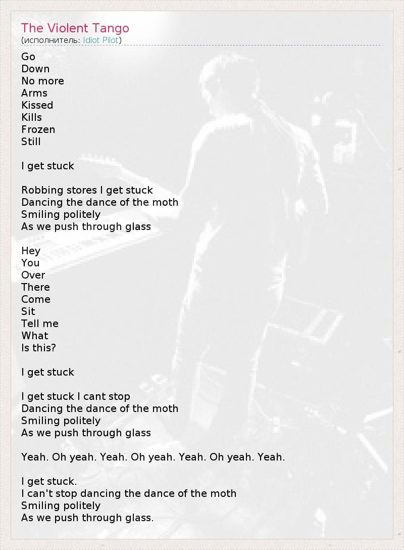 Go Down No more Arms Kissed Kills Frozen Still I get stuck Robbing stores I get stuck Dancing the dance of the moth Smiling politely As we push through glass Hey You Over There Come Sit Tell me What Is this? I get stuck I get stuck I cant stop Dancing the dance of the moth Smiling politely As we push through glass Yeah. Oh yeah. Yeah. Oh yeah. Yeah. Oh yeah. Yeah. I get stuck. I can't stop dancing the dance of the moth Smiling politely As we push through glass.