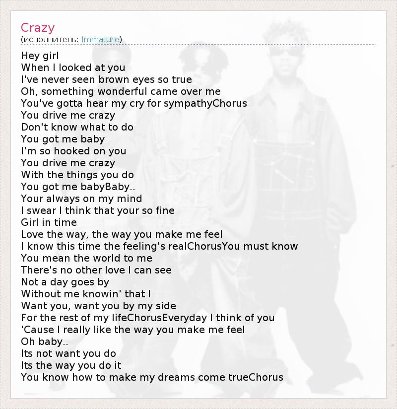 Hey girl When I looked at you I've never seen brown eyes so true Oh, something wonderful came over me You've gotta hear my cry for sympathyChorus You drive me crazy Don't know what to do You got me baby I'm so hooked on you You drive me crazy With the things you do You got me babyBaby.. Your always on my mind I swear I think that your so fine Girl in time Love the way, the way you make me feel I know this time the feeling's realChorusYou must know You mean the world to me There's no other love I can see Not a day goes by Without me knowin' that I Want you, want you by my side For the rest of my lifeChorusEveryday I think of you 'Cause I really like the way you make me feel Oh baby.. Its not want you do Its the way you do it You know how to make my dreams come trueChorus