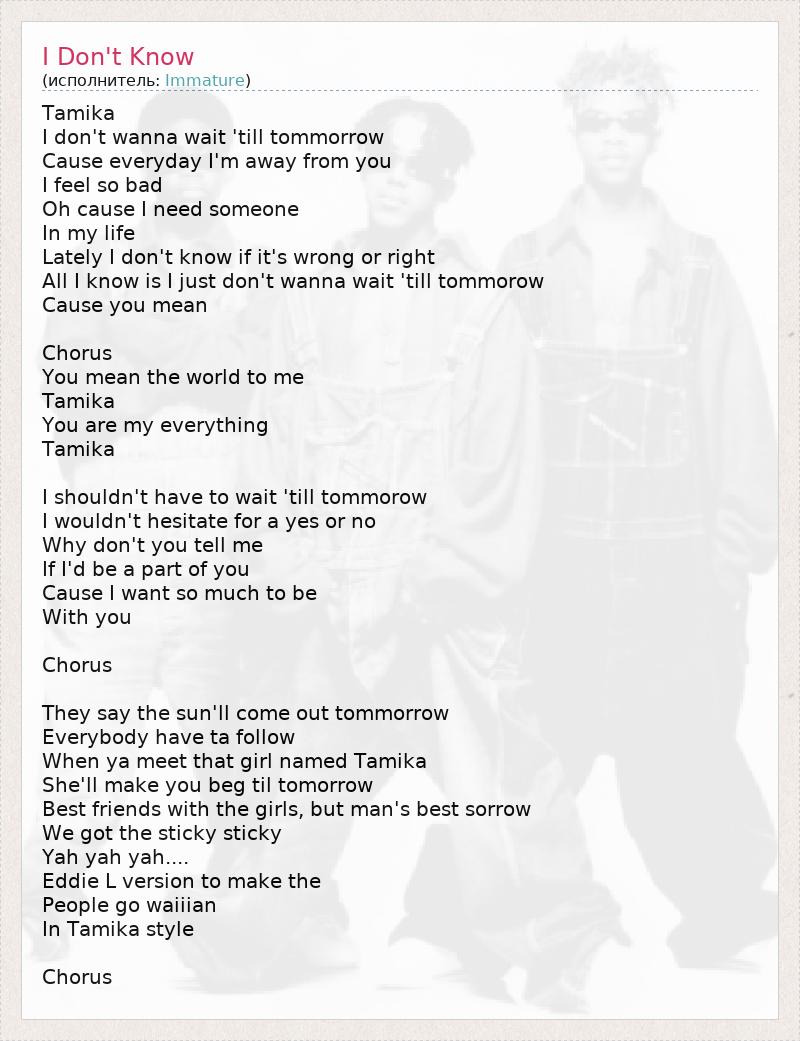 Tamika I don't wanna wait 'till tommorrow Cause everyday I'm away from you I feel so bad Oh cause I need someone In my life Lately I don't know if it's wrong or right All I know is I just don't wanna wait 'till tommorow Cause you mean Chorus You mean the world to me Tamika You are my everything Tamika I shouldn't have to wait 'till tommorow I wouldn't hesitate for a yes or no Why don't you tell me If I'd be a part of you Cause I want so much to be With you Chorus They say the sun'll come out tommorrow Everybody have ta follow When ya meet that girl named Tamika She'll make you beg til tomorrow Best friends with the girls, but man's best sorrow We got the sticky sticky Yah yah yah.... Eddie L version to make the People go waiiian In Tamika style Chorus