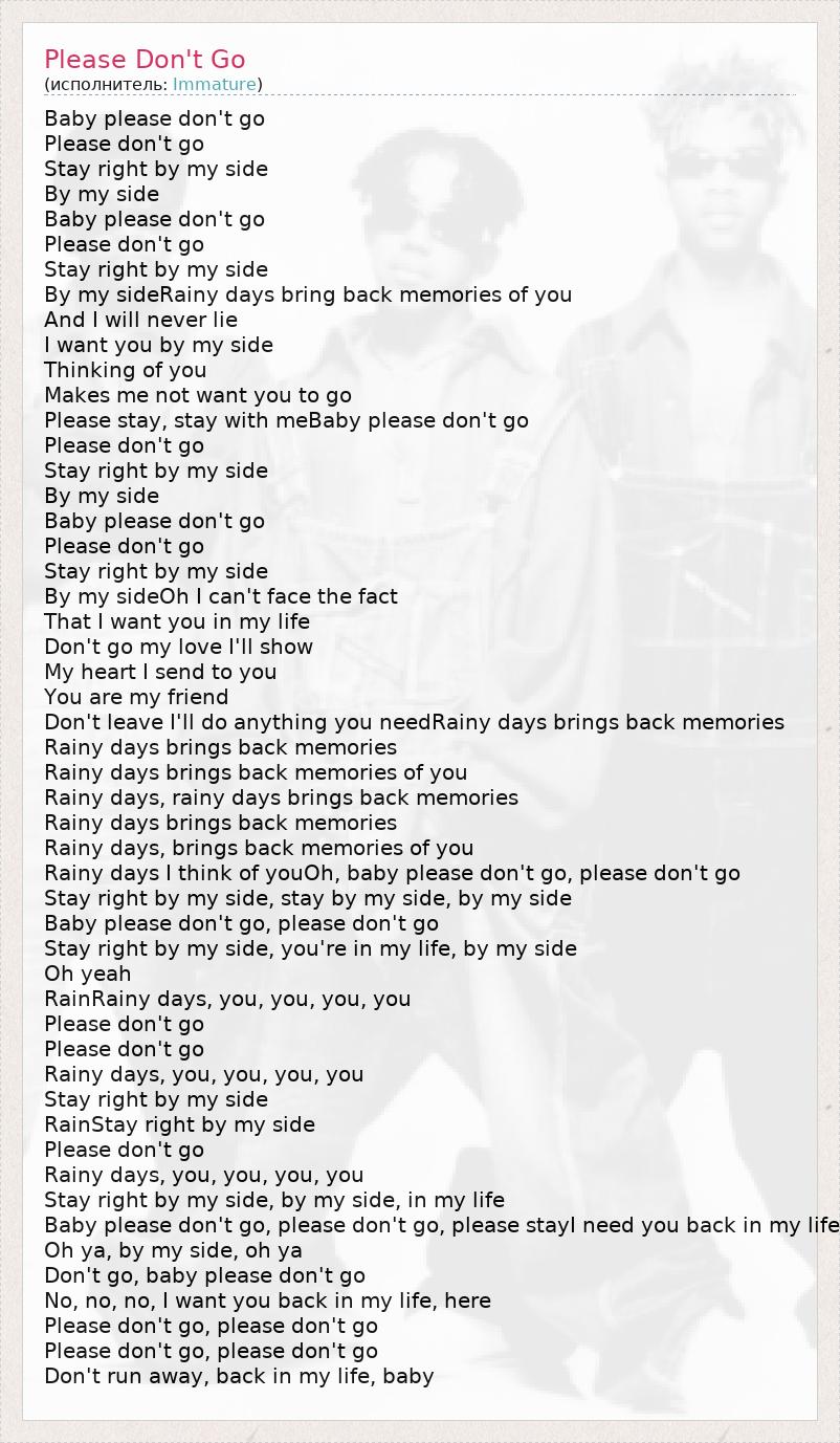 Baby please don't go Please don't go Stay right by my side By my side Baby please don't go Please don't go Stay right by my side By my sideRainy days bring back memories of you And I will never lie I want you by my side Thinking of you Makes me not want you to go Please stay, stay with meBaby please don't go Please don't go Stay right by my side By my side Baby please don't go Please don't go Stay right by my side By my sideOh I can't face the fact That I want you in my life Don't go my love I'll show My heart I send to you You are my friend Don't leave I'll do anything you needRainy days brings back memories Rainy days brings back memories Rainy days brings back memories of you Rainy days, rainy days brings back memories Rainy days brings back memories Rainy days, brings back memories of you Rainy days I think of youOh, baby please don't go, please don't go Stay right by my side, stay by my side, by my side Baby please don't go, please don't go Stay right by my side, you're in my life, by my side Oh yeah RainRainy days, you, you, you, you Please don't go Please don't go Rainy days, you, you, you, you Stay right by my side RainStay right by my side Please don't go Rainy days, you, you, you, you Stay right by my side, by my side, in my life Baby please don't go, please don't go, please stayI need you back in my life Oh ya, by my side, oh ya Don't go, baby please don't go No, no, no, I want you back in my life, here Please don't go, please don't go Please don't go, please don't go Don't run away, back in my life, baby