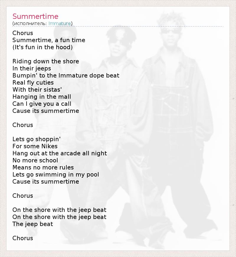 Chorus Summertime, a fun time (It's fun in the hood) Riding down the shore In their jeeps Bumpin' to the Immature dope beat Real fly cuties With their sistas' Hanging in the mall Can I give you a call Cause its summertime Chorus Lets go shoppin' For some Nikes Hang out at the arcade all night No more school Means no more rules Lets go swimming in my pool Cause its summertime Chorus On the shore with the jeep beat On the shore with the jeep beat The jeep beat Chorus