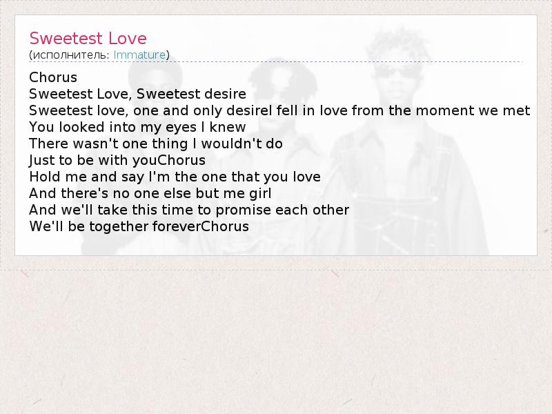 Chorus Sweetest Love, Sweetest desire Sweetest love, one and only desireI fell in love from the moment we met You looked into my eyes I knew There wasn't one thing I wouldn't do Just to be with youChorus Hold me and say I'm the one that you love And there's no one else but me girl And we'll take this time to promise each other We'll be together foreverChorus