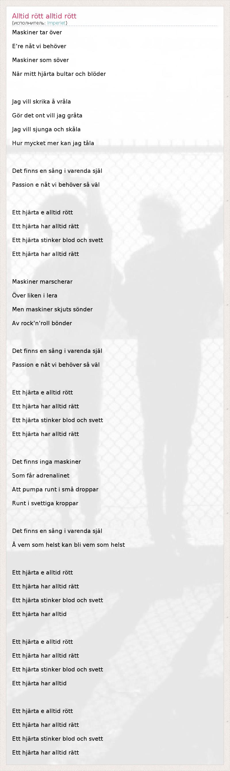Maskiner tar över E're nåt vi behöver Maskiner som söver När mitt hjärta bultar och blöder Jag vill skrika å vråla Gör det ont vill jag gråta Jag vill sjunga och skåla Hur mycket mer kan jag tåla Det finns en sång i varenda själ Passion e nåt vi behöver så väl Ett hjärta e alltid rött Ett hjärta har alltid rätt Ett hjärta stinker blod och svett Ett hjärta har alltid rätt Maskiner marscherar Över liken i lera Men maskiner skjuts sönder Av rock'n'roll bönder Det finns en sång i varenda själ Passion e nåt vi behöver så väl Ett hjärta e alltid rött Ett hjärta har alltid rätt Ett hjärta stinker blod och svett Ett hjärta har alltid rätt Det finns inga maskiner Som får adrenalinet Att pumpa runt i små droppar Runt i svettiga kroppar Det finns en sång i varenda själ Å vem som helst kan bli vem som helst Ett hjärta e alltid rött Ett hjärta har alltid rätt Ett hjärta stinker blod och svett Ett hjärta har alltid Ett hjärta e alltid rött Ett hjärta har alltid rätt Ett hjärta stinker blod och svett Ett hjärta har alltid Ett hjärta e alltid rött Ett hjärta har alltid rätt Ett hjärta stinker blod och svett Ett hjärta har alltid rätt