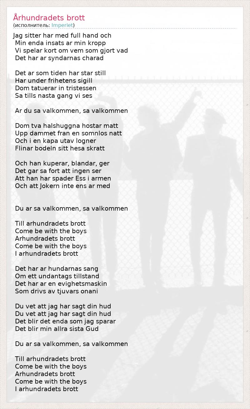 Jag sitter har med full hand och Min enda insats ar min kropp Vi spelar kort om vem som gjort vad Det har ar syndarnas charad Det ar som tiden har star still Har under frihetens sigill Dom tatuerar in tristessen Sa tills nasta gang vi ses Ar du sa valkommen, sa valkommen Dom tva halshuggna hostar matt Upp dammet fran en somnlos natt Och i en kapa utav logner Flinar bodeln sitt hesa skratt Och han kuperar, blandar, ger Det gar sa fort att ingen ser Att han har spader Ess i armen Och att Jokern inte ens ar med Du ar sa valkommen, sa valkommen Till arhundradets brott Come be with the boys Arhundradets brott Come be with the boys I arhundradets brott Det har ar hundarnas sang Om ett undantags tillstand Det har ar en evighetsmaskin Som drivs av tjuvars onani Du vet att jag har sagt din hud Du vet att jag har sagt din hud Det blir det enda som jag sparar Det blir min allra sista Gud Du ar sa valkommen, sa valkommen Till arhundradets brott Come be with the boys Arhundradets brott Come be with the boys I arhundradets brott