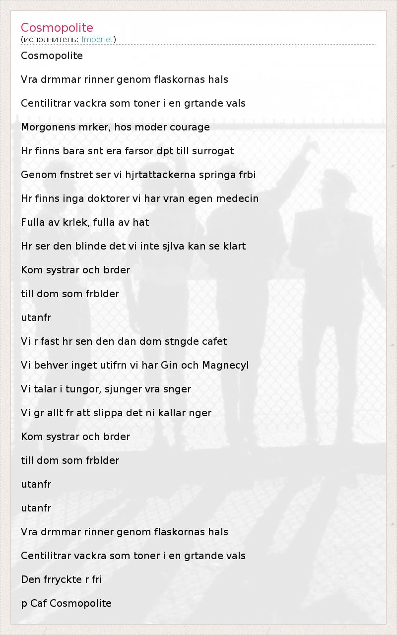 Cosmopolite Vra drmmar rinner genom flaskornas hals Centilitrar vackra som toner i en grtande vals Morgonens mrker, hos moder courage Hr finns bara snt era farsor dpt till surrogat Genom fnstret ser vi hjrtattackerna springa frbi Hr finns inga doktorer vi har vran egen medecin Fulla av krlek, fulla av hat Hr ser den blinde det vi inte sjlva kan se klart Kom systrar och brder till dom som frblder utanfr Vi r fast hr sen den dan dom stngde cafet Vi behver inget utifrn vi har Gin och Magnecyl Vi talar i tungor, sjunger vra snger Vi gr allt fr att slippa det ni kallar nger Kom systrar och brder till dom som frblder utanfr utanfr Vra drmmar rinner genom flaskornas hals Centilitrar vackra som toner i en grtande vals Den frryckte r fri p Caf Cosmopolite
