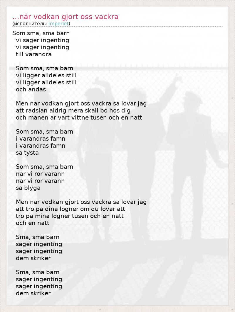 Som sma, sma barn vi sager ingenting vi sager ingenting till varandra Som sma, sma barn vi ligger alldeles still vi ligger alldeles still och andas Men nar vodkan gjort oss vackra sa lovar jag att radslan aldrig mera skall bo hos dig och manen ar vart vittne tusen och en natt Som sma, sma barn i varandras famn i varandras famn sa tysta Som sma, sma barn nar vi ror varann nar vi ror varann sa blyga Men nar vodkan gjort oss vackra sa lovar jag att tro pa dina logner om du lovar att tro pa mina logner tusen och en natt och en natt Sma, sma barn sager ingenting sager ingenting dem skriker Sma, sma barn sager ingenting sager ingenting dem skriker