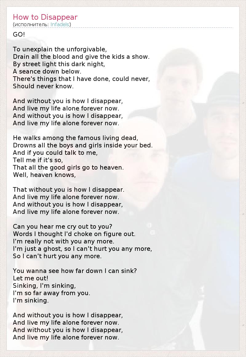 GO! To unexplain the unforgivable, Drain all the blood and give the kids a show. By street light this dark night, A sеance down below. There's things that I have done, could never, Should never know. And without you is how I disappear, And live my life alone forever now. And without you is how I disappear, And live my life alone forever now. He walks among the famous living dead, Drowns all the boys and girls inside your bed. And if you could talk to me, Tell me if it's so, That all the good girls go to heaven. Well, heaven knows, That without you is how I disappear. And live my life alone forever now. And without you is how I disappear, And live my life alone forever now. Can you hear me cry out to you? Words I thought I'd choke on figure out. I'm really not with you any more. I'm just a ghost, so I can't hurt you any more, So I can't hurt you any more. You wanna see how far down I can sink? Let me out! Sinking, I'm sinking, I'm so far away from you. I'm sinking. And without you is how I disappear, And live my life alone forever now. And without you is how I disappear, And live my life alone forever now.