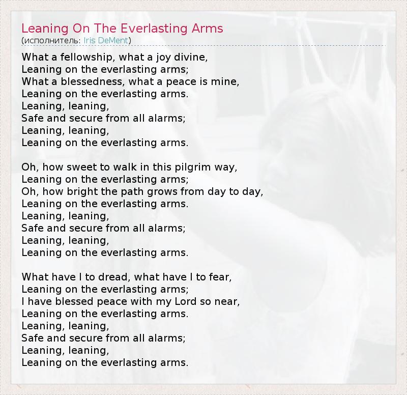 What a fellowship, what a joy divine, Leaning on the everlasting arms; What a blessedness, what a peace is mine, Leaning on the everlasting arms. Leaning, leaning, Safe and secure from all alarms; Leaning, leaning, Leaning on the everlasting arms. Oh, how sweet to walk in this pilgrim way, Leaning on the everlasting arms; Oh, how bright the path grows from day to day, Leaning on the everlasting arms. Leaning, leaning, Safe and secure from all alarms; Leaning, leaning, Leaning on the everlasting arms. What have I to dread, what have I to fear, Leaning on the everlasting arms; I have blessed peace with my Lord so near, Leaning on the everlasting arms. Leaning, leaning, Safe and secure from all alarms; Leaning, leaning, Leaning on the everlasting arms.