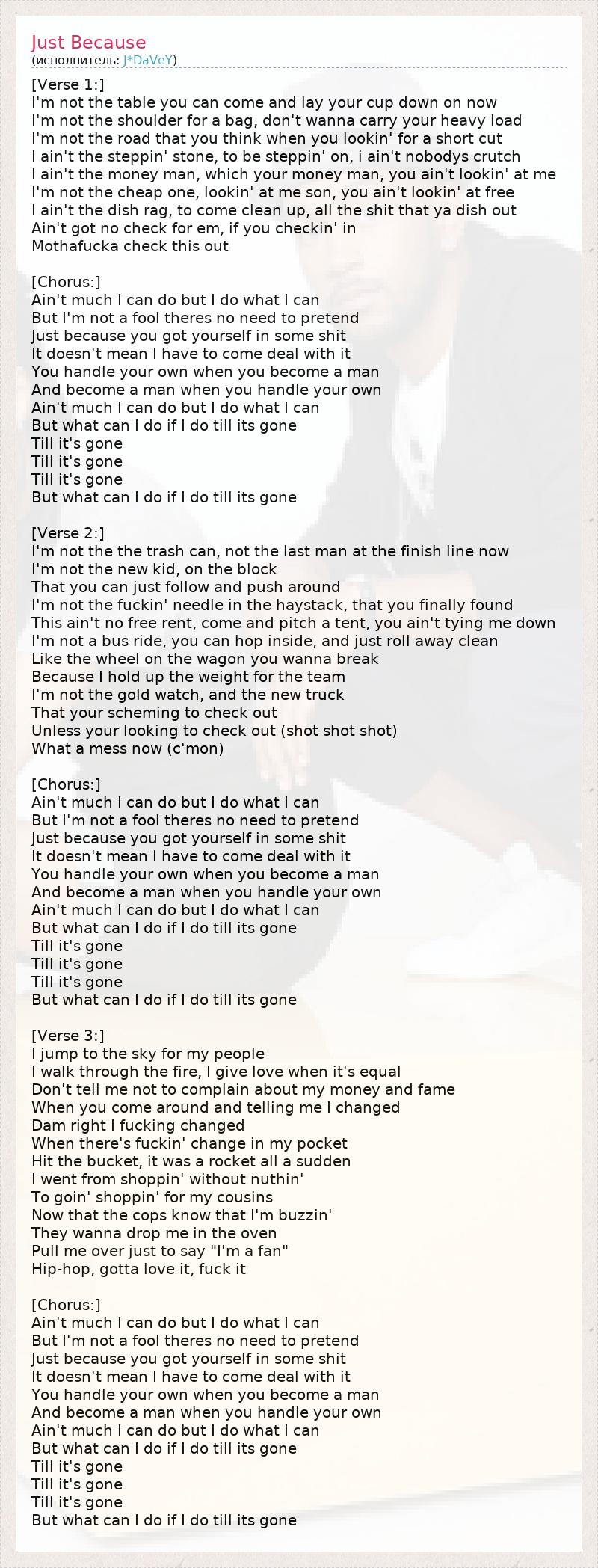 [Verse 1:] I'm not the table you can come and lay your cup down on now I'm not the shoulder for a bag, don't wanna carry your heavy load I'm not the road that you think when you lookin' for a short cut I ain't the steppin' stone, to be steppin' on, i ain't nobodys crutch I ain't the money man, which your money man, you ain't lookin' at me I'm not the cheap one, lookin' at me son, you ain't lookin' at free I ain't the dish rag, to come clean up, all the shit that ya dish out Ain't got no check for em, if you checkin' in Mothafucka check this out [Chorus:] Ain't much I can do but I do what I can But I'm not a fool theres no need to pretend Just because you got yourself in some shit It doesn't mean I have to come deal with it You handle your own when you become a man And become a man when you handle your own Ain't much I can do but I do what I can But what can I do if I do till its gone Till it's gone Till it's gone Till it's gone But what can I do if I do till its gone [Verse 2:] I'm not the the trash can, not the last man at the finish line now I'm not the new kid, on the block That you can just follow and push around I'm not the fuckin' needle in the haystack, that you finally found This ain't no free rent, come and pitch a tent, you ain't tying me down I'm not a bus ride, you can hop inside, and just roll away clean Like the wheel on the wagon you wanna break Because I hold up the weight for the team I'm not the gold watch, and the new truck That your scheming to check out Unless your looking to check out (shot shot shot) What a mess now (c'mon) [Chorus:] Ain't much I can do but I do what I can But I'm not a fool theres no need to pretend Just because you got yourself in some shit It doesn't mean I have to come deal with it You handle your own when you become a man And become a man when you handle your own Ain't much I can do but I do what I can But what can I do if I do till its gone Till it's gone Till it's gone Till it's gone But what can I do if I do till its gone [Verse 3:] I jump to the sky for my people I walk through the fire, I give love when it's equal Don't tell me not to complain about my money and fame When you come around and telling me I changed Dam right I fucking changed When there's fuckin' change in my pocket Hit the bucket, it was a rocket all a sudden I went from shoppin' without nuthin' To goin' shoppin' for my cousins Now that the cops know that I'm buzzin' They wanna drop me in the oven Pull me over just to say "I'm a fan" Hip-hop, gotta love it, fuck it [Chorus:] Ain't much I can do but I do what I can But I'm not a fool theres no need to pretend Just because you got yourself in some shit It doesn't mean I have to come deal with it You handle your own when you become a man And become a man when you handle your own Ain't much I can do but I do what I can But what can I do if I do till its gone Till it's gone Till it's gone Till it's gone But what can I do if I do till its gone