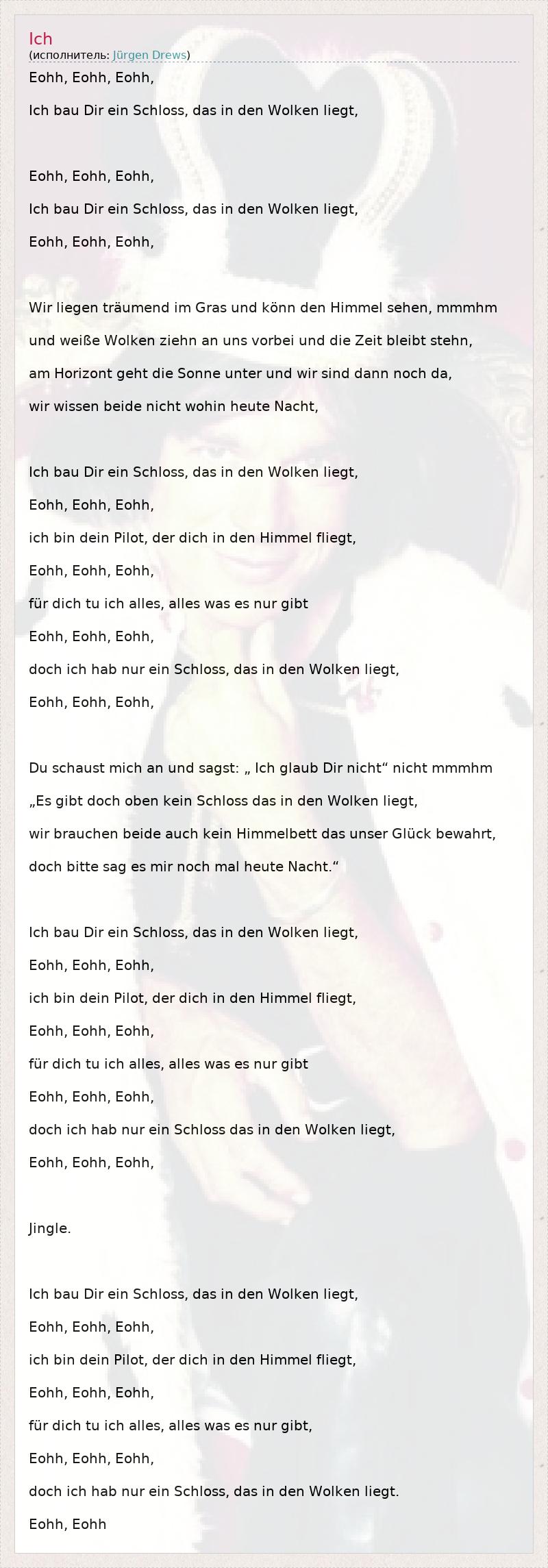 Eohh, Eohh, Eohh, Ich bau Dir ein Schloss, das in den Wolken liegt, Eohh, Eohh, Eohh, Ich bau Dir ein Schloss, das in den Wolken liegt, Eohh, Eohh, Eohh, Wir liegen träumend im Gras und könn den Himmel sehen, mmmhm und weiße Wolken ziehn an uns vorbei und die Zeit bleibt stehn, am Horizont geht die Sonne unter und wir sind dann noch da, wir wissen beide nicht wohin heute Nacht, Ich bau Dir ein Schloss, das in den Wolken liegt, Eohh, Eohh, Eohh, ich bin dein Pilot, der dich in den Himmel fliegt, Eohh, Eohh, Eohh, für dich tu ich alles, alles was es nur gibt Eohh, Eohh, Eohh, doch ich hab nur ein Schloss, das in den Wolken liegt, Eohh, Eohh, Eohh, Du schaust mich an und sagst: „ Ich glaub Dir nicht“ nicht mmmhm „Es gibt doch oben kein Schloss das in den Wolken liegt, wir brauchen beide auch kein Himmelbett das unser Glück bewahrt, doch bitte sag es mir noch mal heute Nacht.“ Ich bau Dir ein Schloss, das in den Wolken liegt, Eohh, Eohh, Eohh, ich bin dein Pilot, der dich in den Himmel fliegt, Eohh, Eohh, Eohh, für dich tu ich alles, alles was es nur gibt Eohh, Eohh, Eohh, doch ich hab nur ein Schloss das in den Wolken liegt, Eohh, Eohh, Eohh, Jingle. Ich bau Dir ein Schloss, das in den Wolken liegt, Eohh, Eohh, Eohh, ich bin dein Pilot, der dich in den Himmel fliegt, Eohh, Eohh, Eohh, für dich tu ich alles, alles was es nur gibt, Eohh, Eohh, Eohh, doch ich hab nur ein Schloss, das in den Wolken liegt. Eohh, Eohh
