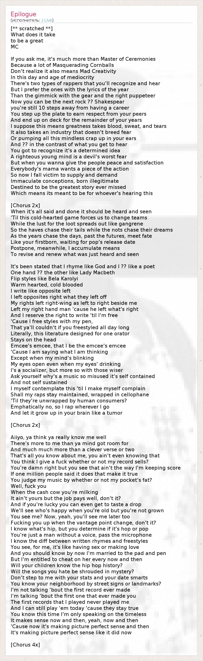 [** scratched **] What does it take to be a great MC If you ask me, it's much more than Master of Ceremonies Because a lot of Masquerading Cornballs Don't realize it also means Mad Creativity In this day and age of mediocrity There's two types of rappers that you'll recognize and hear But I prefer the ones with the lyrics of the year Than the gimmick with the gear and the right puppeteer Now you can be the next rock ?? Shakespear you're still 10 steps away from having a career You step up the plate to earn respect from your peers And end up on deck for the remainder of your years I suppose this means greatness takes blood, sweat, and tears It also takes an industry that doesn't breed fear Or pumping all this mindless crap up in your ears And ?? in the contrast of what you get to hear You got to recognize it's a determined idea A righteous young mind is a devil's worst fear But when you wanna give the people peace and satisfaction Everybody's mama wants a piece of the action So now I fall victim to supply and demand Immaculate conceptions, born illegitimate Destined to be the greatest story ever missed Which means its meant to be for whoever's hearing this [Chorus 2x] When it's all said and done it should be heard and seen 'Til this cold-hearted game forces us to change teams While the lust for the loot spreads out like gangrene So the haves chase their tails while the nots chase their dreams As the years chase the days, past the futures, meet fate Like your firstborn, waiting for pop's release date Postpone, meanwhile, I accumulate means To revise and renew what was just heard and seen It's been stated that I rhyme like God and I ?? like a poet One hand ?? the other like Lady Macbeth Flip styles like Bela Karolyi Warm hearted, cold blooded I write like opposite left I left opposites right what they left off My rights left right-wing as left to right beside me Left my right hand man 'cause he left what's right And I reserve the right to write 'til I'm free 'Cause I free styles with my pen, That ya'll couldn't if you freestyled all day long Literally, this literature designed for one orator Stays on the head Emcee's emcee, that I be the emcee's emcee 'Cause I am saying what I am thinking Except when my mind's blinking My eyes open even when my eyes' drinking I's a socializer, but more so with those wiser Ask yourself why's a music so misused it's self contained And not self sustained I myself contemplate this 'til I make myself complain Shall my raps stay maintained, wrapped in cellophane 'Til they're unwrapped by human consumers? Emphatically no, so I rap wherever I go And let it grow up in your brain like a tumor [Chorus 2x] Aiiyo, ya think ya really know me well There's more to me than ya mind got room for And much much more than a clever verse or two That's all you know about me, you ain't even knowing that You think I give a fuck whether or not my record sells? You're damn right but you see that ain't the way I'm keeping score If one million people said it does that make it true You judge my music by whether or not my pocket's fat? Well, fuck you When the cash cow you're milking It ain't yours but the job pays well, don't it? And if you're lucky you can even get to taste a drop We'll see who's happy when you're old but you're not grown You see me? Now, yeah, you'll see me later too Fucking you up when the vantage point change, don't it? I know what's hip, but you determine if it's hop or pop You're just a man without a voice, pass the microphone I know the diff between written rhymes and freestyles You see, for me, it's like having sex or making love And you should know by now I'm married to the pad and pen But I'm entitled to cheat on her every now and then Will your children know the hip hop history? Will the songs you hate be shrouded in mystery? Don't step to me with your stats and your date smarts You know your neighborhood by street signs or landmarks? I'm not talking 'bout the first record ever made I'm talking 'bout the first one that ever made you The first records that I played never played me And I can still play 'em today 'cause they stay true You know this time I'm only speaking on the timeless It makes sense now and then, yeah, now and then 'Cause now it's making picture perfect sense and then It's making picture perfect sense like it did now [Chorus 4x]