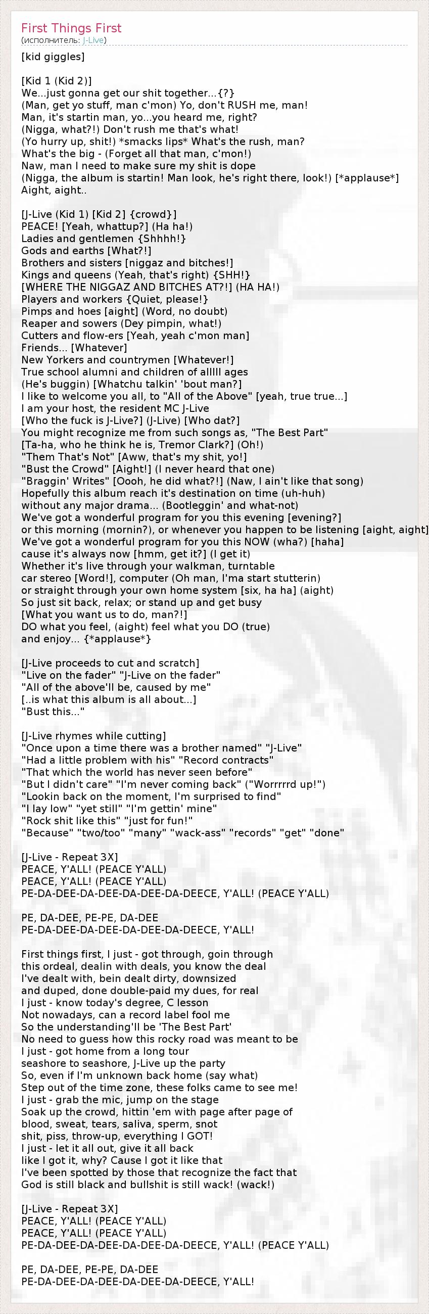 Это интересно:J-Live (также известный как Justice Allah, настоящее имя Jean-Jacques Cadet) является МС, DJ и продсером из Нью-Йорка, кроме этого еще и основателем Triple Threat Productions. Впервые J-Live засветился на хип-хоп андерграунд сцене в 1995, будучи еще новичком и студентом университета Олбани, государственного университета Нью-Йорка. Его первый сингл "Longevity" появился на CD Mark Farina "Mushroom Jazz",... продолжение