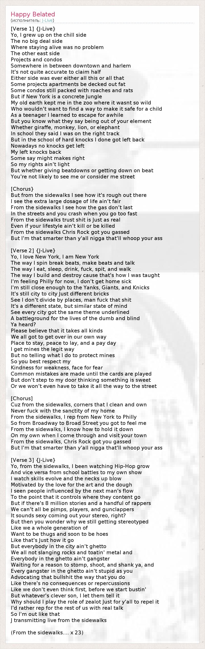 Это интересно:J-Live (также известный как Justice Allah, настоящее имя Jean-Jacques Cadet) является МС, DJ и продсером из Нью-Йорка, кроме этого еще и основателем Triple Threat Productions. Впервые J-Live засветился на хип-хоп андерграунд сцене в 1995, будучи еще новичком и студентом университета Олбани, государственного университета Нью-Йорка. Его первый сингл "Longevity" появился на CD Mark Farina "Mushroom Jazz",... продолжение