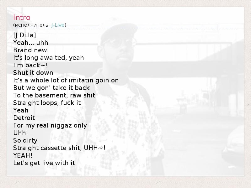 [J Dilla] Yeah... uhh Brand new It's long awaited, yeah I'm back~! Shut it down It's a whole lot of imitatin goin on But we gon' take it back To the basement, raw shit Straight loops, fuck it Yeah Detroit For my real niggaz only Uhh So dirty Straight cassette shit, UHH~! YEAH! Let's get live with it
