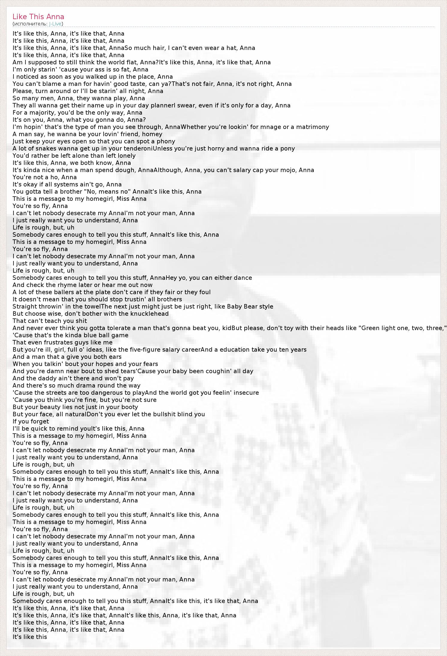 It's like this, Anna, it's like that, Anna It's like this, Anna, it's like that, Anna It's like this, Anna, it's like that, AnnaSo much hair, I can't even wear a hat, Anna It's like this, Anna, it's like that, Anna Am I supposed to still think the world flat, Anna?It's like this, Anna, it's like that, Anna I'm only starin' 'cause your ass is so fat, Anna I noticed as soon as you walked up in the place, Anna You can't blame a man for havin' good taste, can ya?That's not fair, Anna, it's not right, Anna Please, turn around or I'll be starin' all night, Anna So many men, Anna, they wanna play, Anna They all wanna get their name up in your day plannerI swear, even if it's only for a day, Anna For a majority, you'd be the only way, Anna It's on you, Anna, what you gonna do, Anna? I'm hopin' that's the type of man you see through, AnnaWhether you're lookin' for mnage or a matrimony A man say, he wanna be your lovin' friend, homey Just keep your eyes open so that you can spot a phony A lot of snakes wanna get up in your tenderoniUnless you're just horny and wanna ride a pony You'd rather be left alone than left lonely It's like this, Anna, we both know, Anna It's kinda nice when a man spend dough, AnnaAlthough, Anna, you can't salary cap your mojo, Anna You're not a ho, Anna It's okay if all systems ain't go, Anna You gotta tell a brother "No, means no" AnnaIt's like this, Anna This is a message to my homegirl, Miss Anna You're so fly, Anna I can't let nobody desecrate my AnnaI'm not your man, Anna I just really want you to understand, Anna Life is rough, but, uh Somebody cares enough to tell you this stuff, AnnaIt's like this, Anna This is a message to my homegirl, Miss Anna You're so fly, Anna I can't let nobody desecrate my AnnaI'm not your man, Anna I just really want you to understand, Anna Life is rough, but, uh Somebody cares enough to tell you this stuff, AnnaHey yo, you can either dance And check the rhyme later or hear me out now A lot of these ballers at the plate don't care if they fair or they foul It doesn't mean that you should stop trustin' all brothers Straight throwin' in the towelThe next just might just be just right, like Baby Bear style But choose wise, don't bother with the knucklehead That can't teach you shit And never ever think you gotta tolerate a man that's gonna beat you, kidBut please, don't toy with their heads like "Green light one, two, three," 'Cause that's the kinda blue ball game That even frustrates guys like me But you're ill, girl, full o' ideas, like the five-figure salary careerAnd a education take you ten years And a man that a give you both ears When you talkin' bout your hopes and your fears And you're damn near bout to shed tears'Cause your baby been coughin' all day And the daddy ain't there and won't pay And there's so much drama round the way 'Cause the streets are too dangerous to playAnd the world got you feelin' insecure 'Cause you think you're fine, but you're not sure But your beauty lies not just in your booty But your face, all naturalDon't you ever let the bullshit blind you If you forget I'll be quick to remind youIt's like this, Anna This is a message to my homegirl, Miss Anna You're so fly, Anna I can't let nobody desecrate my AnnaI'm not your man, Anna I just really want you to understand, Anna Life is rough, but, uh Somebody cares enough to tell you this stuff, AnnaIt's like this, Anna This is a message to my homegirl, Miss Anna You're so fly, Anna I can't let nobody desecrate my AnnaI'm not your man, Anna I just really want you to understand, Anna Life is rough, but, uh Somebody cares enough to tell you this stuff, AnnaIt's like this, Anna This is a message to my homegirl, Miss Anna You're so fly, Anna I can't let nobody desecrate my AnnaI'm not your man, Anna I just really want you to understand, Anna Life is rough, but, uh Somebody cares enough to tell you this stuff, AnnaIt's like this, Anna This is a message to my homegirl, Miss Anna You're so fly, Anna I can't let nobody desecrate my AnnaI'm not your man, Anna I just really want you to understand, Anna Life is rough, but, uh Somebody cares enough to tell you this stuff, AnnaIt's like this, it's like that, Anna It's like this, Anna, it's like that, Anna It's like this, Anna, it's like that, AnnaIt's like this, Anna, it's like that, Anna It's like this, Anna, it's like that, Anna It's like this, Anna, it's like that, Anna It's like this