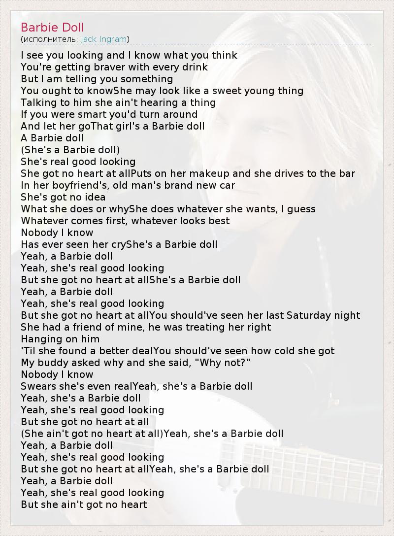 I see you looking and I know what you think You're getting braver with every drink But I am telling you something You ought to knowShe may look like a sweet young thing Talking to him she ain't hearing a thing If you were smart you'd turn around And let her goThat girl's a Barbie doll A Barbie doll (She's a Barbie doll) She's real good looking She got no heart at allPuts on her makeup and she drives to the bar In her boyfriend's, old man's brand new car She's got no idea What she does or whyShe does whatever she wants, I guess Whatever comes first, whatever looks best Nobody I know Has ever seen her cryShe's a Barbie doll Yeah, a Barbie doll Yeah, she's real good looking But she got no heart at allShe's a Barbie doll Yeah, a Barbie doll Yeah, she's real good looking But she got no heart at allYou should've seen her last Saturday night She had a friend of mine, he was treating her right Hanging on him 'Til she found a better dealYou should've seen how cold she got My buddy asked why and she said, "Why not?" Nobody I know Swears she's even realYeah, she's a Barbie doll Yeah, she's a Barbie doll Yeah, she's real good looking But she got no heart at all (She ain't got no heart at all)Yeah, she's a Barbie doll Yeah, a Barbie doll Yeah, she's real good looking But she got no heart at allYeah, she's a Barbie doll Yeah, a Barbie doll Yeah, she's real good looking But she ain't got no heart