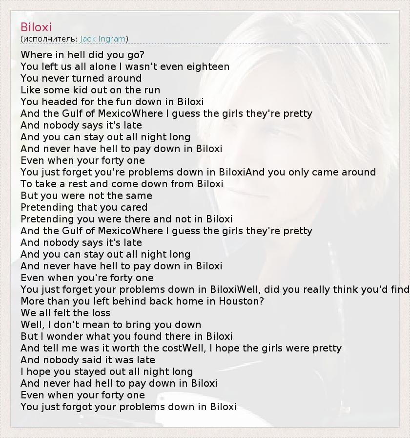 Where in hell did you go? You left us all alone I wasn't even eighteen You never turned around Like some kid out on the run You headed for the fun down in Biloxi And the Gulf of MexicoWhere I guess the girls they're pretty And nobody says it's late And you can stay out all night long And never have hell to pay down in Biloxi Even when your forty one You just forget you're problems down in BiloxiAnd you only came around To take a rest and come down from Biloxi But you were not the same Pretending that you cared Pretending you were there and not in Biloxi And the Gulf of MexicoWhere I guess the girls they're pretty And nobody says it's late And you can stay out all night long And never have hell to pay down in Biloxi Even when you're forty one You just forget your problems down in BiloxiWell, did you really think you'd find More than you left behind back home in Houston? We all felt the loss Well, I don't mean to bring you down But I wonder what you found there in Biloxi And tell me was it worth the costWell, I hope the girls were pretty And nobody said it was late I hope you stayed out all night long And never had hell to pay down in Biloxi Even when your forty one You just forgot your problems down in Biloxi