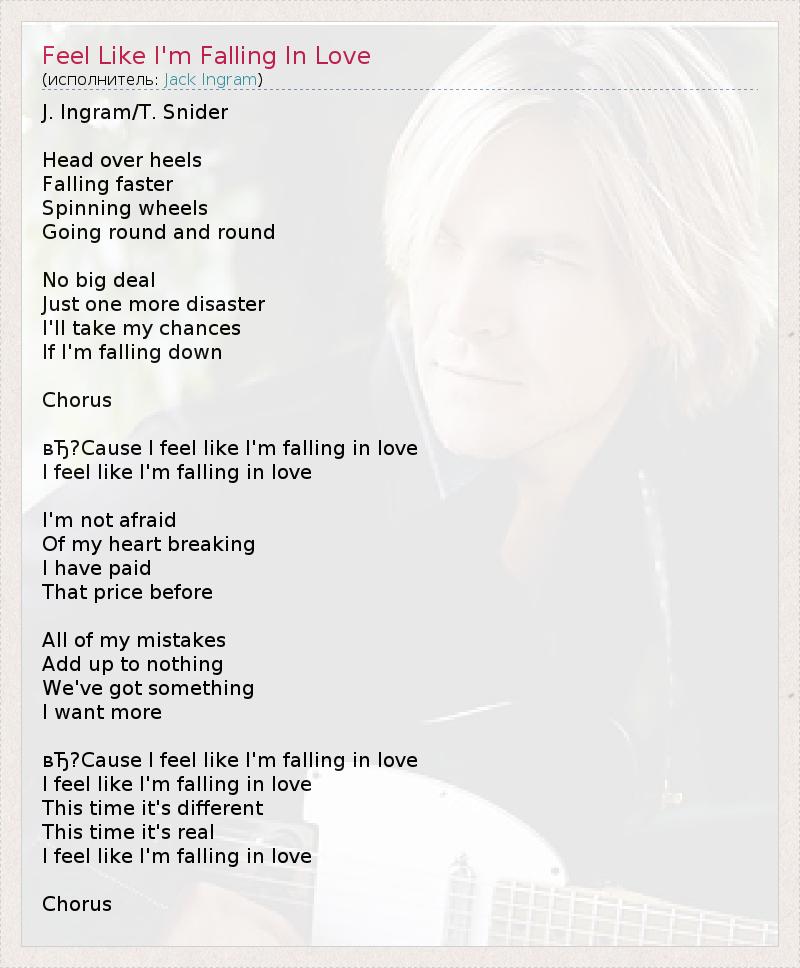 J. Ingram/T. Snider Head over heels Falling faster Spinning wheels Going round and round No big deal Just one more disaster I'll take my chances If I'm falling down Chorus �Cause I feel like I'm falling in love I feel like I'm falling in love I'm not afraid Of my heart breaking I have paid That price before All of my mistakes Add up to nothing We've got something I want more �Cause I feel like I'm falling in love I feel like I'm falling in love This time it's different This time it's real I feel like I'm falling in love Chorus
