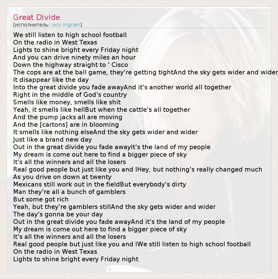 We still listen to high school football On the radio in West Texas Lights to shine bright every Friday night And you can drive ninety miles an hour Down the highway straight to ' Cisco The cops are at the ball game, they're getting tightAnd the sky gets wider and wider It disappear like the day Into the great divide you fade awayAnd it's another world all together Right in the middle of God's country Smells like money, smells like shit Yeah, it smells like hellBut when the cattle's all together And the pump jacks all are moving And the [cartons] are in blooming It smells like nothing elseAnd the sky gets wider and wider Just like a brand new day Out in the great divide you fade awayIt's the land of my people My dream is come out here to find a bigger piece of sky It's all the winners and all the losers Real good people but just like you and IHey, but nothing's really changed much As you drive on down at twenty Mexicans still work out in the fieldBut everybody's dirty Man they're all a bunch of gamblers But some got rich Yeah, but they're gamblers stillAnd the sky gets wider and wider The day's gonna be your day Out in the great divide you fade awayAnd it's the land of my people My dream is come out here to find a bigger piece of sky It's all the winners and all the losers Real good people but just like you and IWe still listen to high school football On the radio in West Texas Lights to shine bright every Friday night