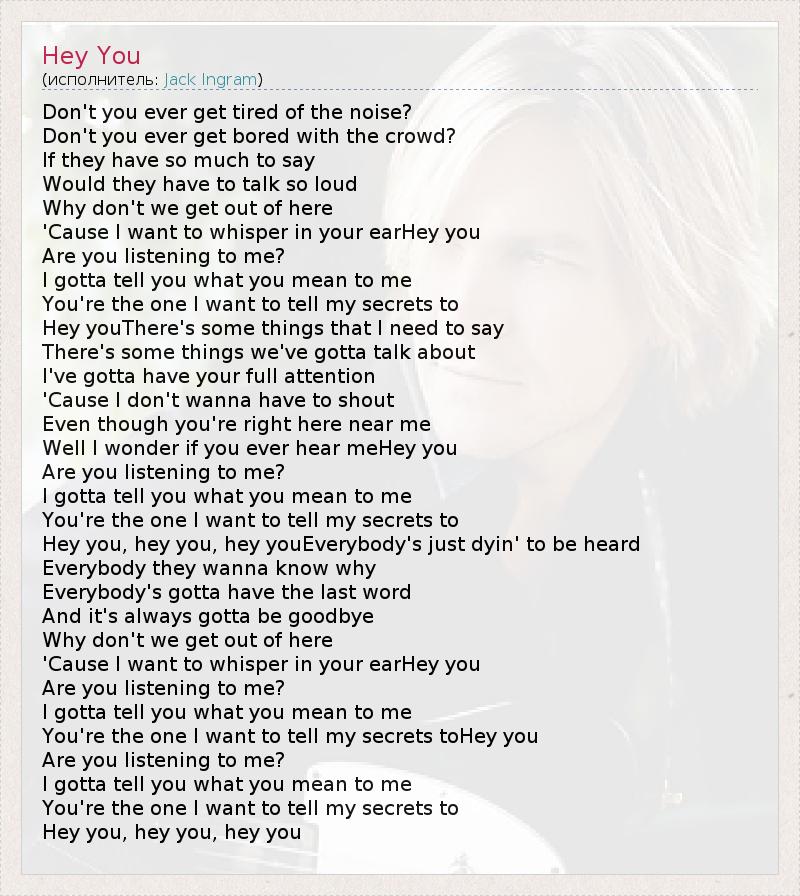Don't you ever get tired of the noise? Don't you ever get bored with the crowd? If they have so much to say Would they have to talk so loud Why don't we get out of here 'Cause I want to whisper in your earHey you Are you listening to me? I gotta tell you what you mean to me You're the one I want to tell my secrets to Hey youThere's some things that I need to say There's some things we've gotta talk about I've gotta have your full attention 'Cause I don't wanna have to shout Even though you're right here near me Well I wonder if you ever hear meHey you Are you listening to me? I gotta tell you what you mean to me You're the one I want to tell my secrets to Hey you, hey you, hey youEverybody's just dyin' to be heard Everybody they wanna know why Everybody's gotta have the last word And it's always gotta be goodbye Why don't we get out of here 'Cause I want to whisper in your earHey you Are you listening to me? I gotta tell you what you mean to me You're the one I want to tell my secrets toHey you Are you listening to me? I gotta tell you what you mean to me You're the one I want to tell my secrets to Hey you, hey you, hey you