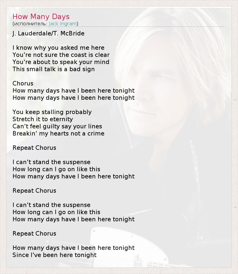 J. Lauderdale/T. McBride I know why you asked me here You're not sure the coast is clear You're about to speak your mind This small talk is a bad sign Chorus How many days have I been here tonight How many days have I been here tonight You keep stalling probably Stretch it to eternity Can't feel guilty say your lines Breakin' my hearts not a crime Repeat Chorus I can't stand the suspense How long can I go on like this How many days have I been here tonight Repeat Chorus I can't stand the suspense How long can I go on like this How many days have I been here tonight Repeat Chorus How many days have I been here tonight Since I've been here tonight