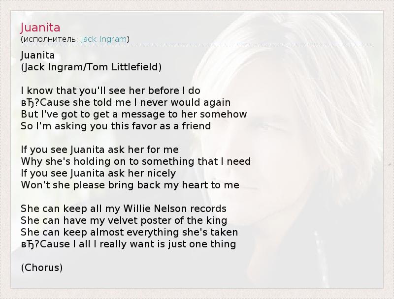 Juanita (Jack Ingram/Tom Littlefield) I know that you'll see her before I do �Cause she told me I never would again But I've got to get a message to her somehow So I'm asking you this favor as a friend If you see Juanita ask her for me Why she's holding on to something that I need If you see Juanita ask her nicely Won't she please bring back my heart to me She can keep all my Willie Nelson records She can have my velvet poster of the king She can keep almost everything she's taken �Cause I all I really want is just one thing (Chorus)
