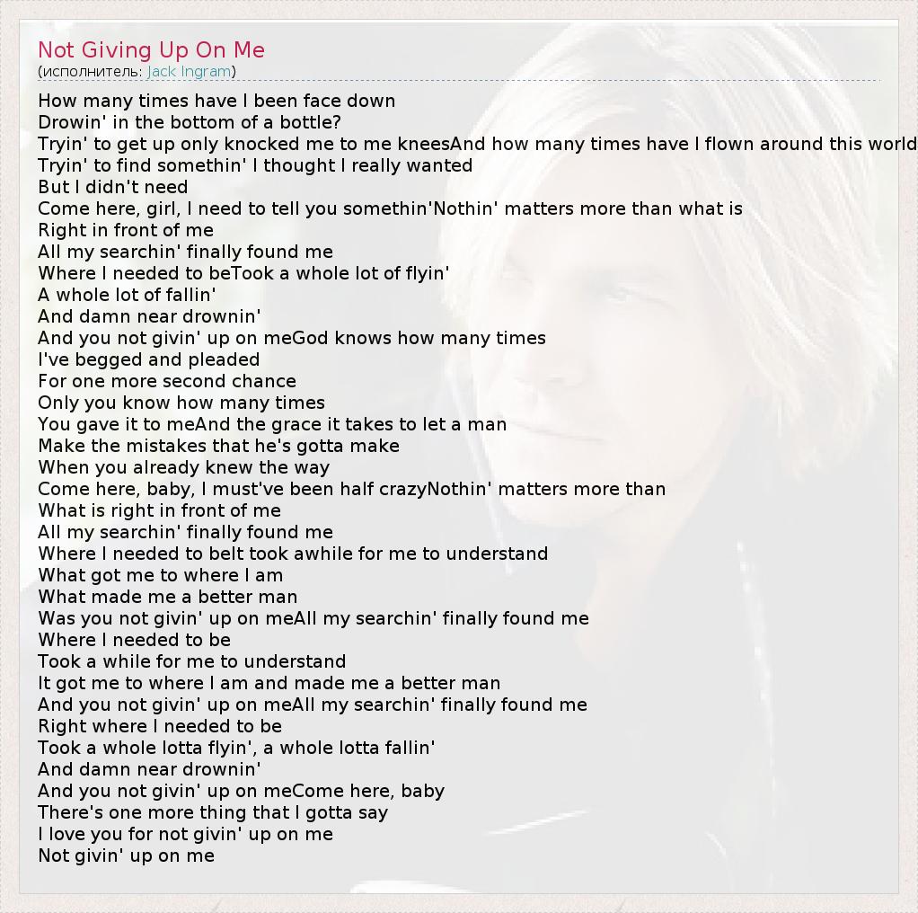 How many times have I been face down Drowin' in the bottom of a bottle? Tryin' to get up only knocked me to me kneesAnd how many times have I flown around this world Tryin' to find somethin' I thought I really wanted But I didn't need Come here, girl, I need to tell you somethin'Nothin' matters more than what is Right in front of me All my searchin' finally found me Where I needed to beTook a whole lot of flyin' A whole lot of fallin' And damn near drownin' And you not givin' up on meGod knows how many times I've begged and pleaded For one more second chance Only you know how many times You gave it to meAnd the grace it takes to let a man Make the mistakes that he's gotta make When you already knew the way Come here, baby, I must've been half crazyNothin' matters more than What is right in front of me All my searchin' finally found me Where I needed to beIt took awhile for me to understand What got me to where I am What made me a better man Was you not givin' up on meAll my searchin' finally found me Where I needed to be Took a while for me to understand It got me to where I am and made me a better man And you not givin' up on meAll my searchin' finally found me Right where I needed to be Took a whole lotta flyin', a whole lotta fallin' And damn near drownin' And you not givin' up on meCome here, baby There's one more thing that I gotta say I love you for not givin' up on me Not givin' up on me