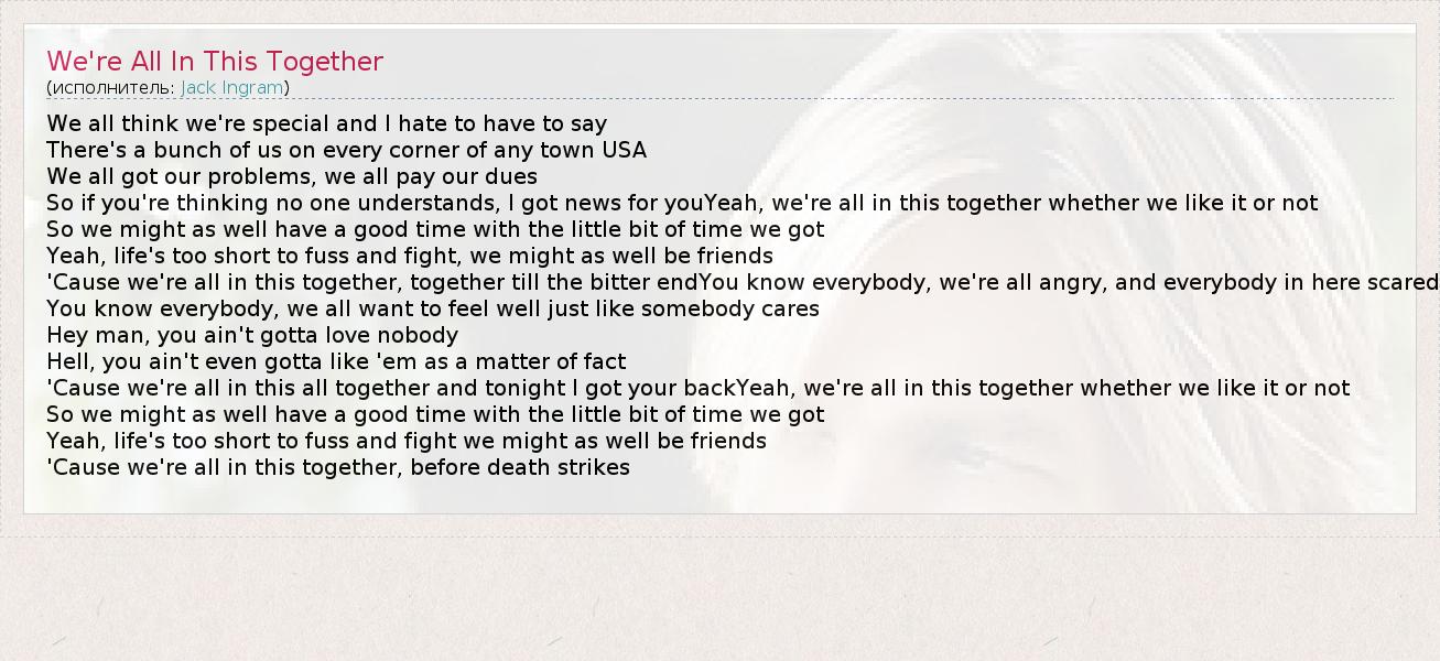 We all think we're special and I hate to have to say There's a bunch of us on every corner of any town USA We all got our problems, we all pay our dues So if you're thinking no one understands, I got news for youYeah, we're all in this together whether we like it or not So we might as well have a good time with the little bit of time we got Yeah, life's too short to fuss and fight, we might as well be friends 'Cause we're all in this together, together till the bitter endYou know everybody, we're all angry, and everybody in here scared You know everybody, we all want to feel well just like somebody cares Hey man, you ain't gotta love nobody Hell, you ain't even gotta like 'em as a matter of fact 'Cause we're all in this all together and tonight I got your backYeah, we're all in this together whether we like it or not So we might as well have a good time with the little bit of time we got Yeah, life's too short to fuss and fight we might as well be friends 'Cause we're all in this together, before death strikes