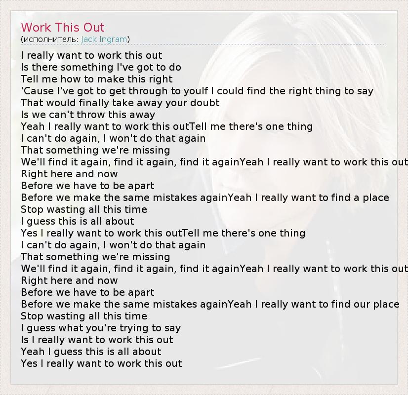 I really want to work this out Is there something I've got to do Tell me how to make this right 'Cause I've got to get through to youIf I could find the right thing to say That would finally take away your doubt Is we can't throw this away Yeah I really want to work this outTell me there's one thing I can't do again, I won't do that again That something we're missing We'll find it again, find it again, find it againYeah I really want to work this out Right here and now Before we have to be apart Before we make the same mistakes againYeah I really want to find a place Stop wasting all this time I guess this is all about Yes I really want to work this outTell me there's one thing I can't do again, I won't do that again That something we're missing We'll find it again, find it again, find it againYeah I really want to work this out Right here and now Before we have to be apart Before we make the same mistakes againYeah I really want to find our place Stop wasting all this time I guess what you're trying to say Is I really want to work this out Yeah I guess this is all about Yes I really want to work this out