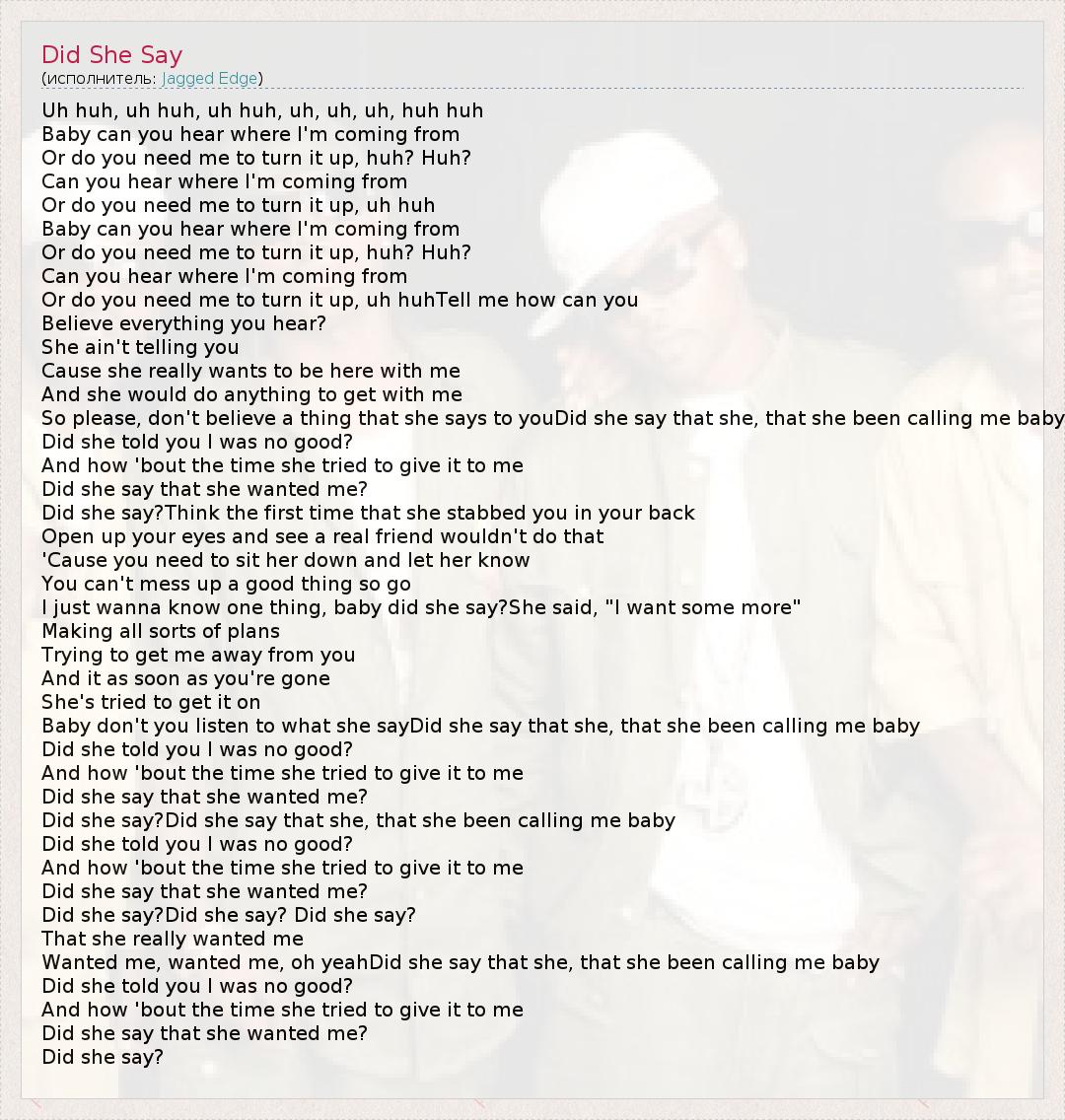 Uh huh, uh huh, uh huh, uh, uh, uh, huh huh Baby can you hear where I'm coming from Or do you need me to turn it up, huh? Huh? Can you hear where I'm coming from Or do you need me to turn it up, uh huh Baby can you hear where I'm coming from Or do you need me to turn it up, huh? Huh? Can you hear where I'm coming from Or do you need me to turn it up, uh huhTell me how can you Believe everything you hear? She ain't telling you Cause she really wants to be here with me And she would do anything to get with me So please, don't believe a thing that she says to youDid she say that she, that she been calling me baby Did she told you I was no good? And how 'bout the time she tried to give it to me Did she say that she wanted me? Did she say?Think the first time that she stabbed you in your back Open up your eyes and see a real friend wouldn't do that 'Cause you need to sit her down and let her know You can't mess up a good thing so go I just wanna know one thing, baby did she say?She said, "I want some more" Making all sorts of plans Trying to get me away from you And it as soon as you're gone She's tried to get it on Baby don't you listen to what she sayDid she say that she, that she been calling me baby Did she told you I was no good? And how 'bout the time she tried to give it to me Did she say that she wanted me? Did she say?Did she say that she, that she been calling me baby Did she told you I was no good? And how 'bout the time she tried to give it to me Did she say that she wanted me? Did she say?Did she say? Did she say? That she really wanted me Wanted me, wanted me, oh yeahDid she say that she, that she been calling me baby Did she told you I was no good? And how 'bout the time she tried to give it to me Did she say that she wanted me? Did she say?