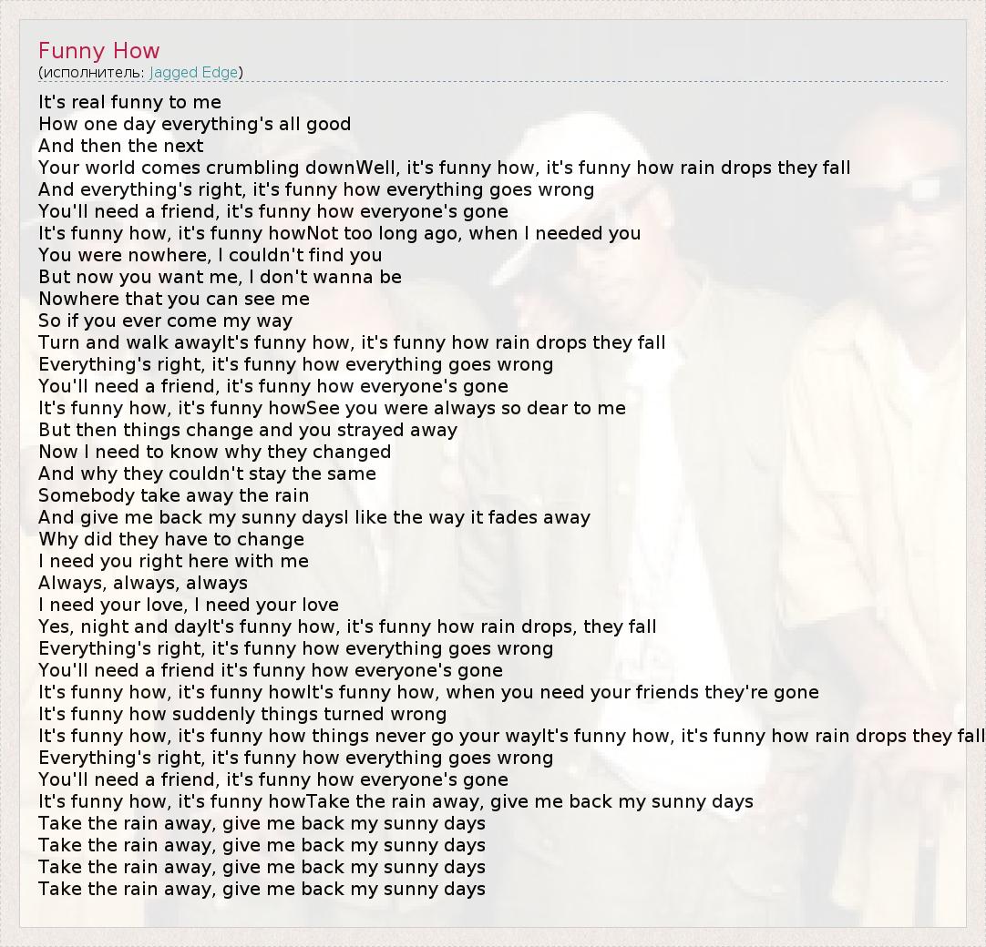 It's real funny to me How one day everything's all good And then the next Your world comes crumbling downWell, it's funny how, it's funny how rain drops they fall And everything's right, it's funny how everything goes wrong You'll need a friend, it's funny how everyone's gone It's funny how, it's funny howNot too long ago, when I needed you You were nowhere, I couldn't find you But now you want me, I don't wanna be Nowhere that you can see me So if you ever come my way Turn and walk awayIt's funny how, it's funny how rain drops they fall Everything's right, it's funny how everything goes wrong You'll need a friend, it's funny how everyone's gone It's funny how, it's funny howSee you were always so dear to me But then things change and you strayed away Now I need to know why they changed And why they couldn't stay the same Somebody take away the rain And give me back my sunny daysI like the way it fades away Why did they have to change I need you right here with me Always, always, always I need your love, I need your love Yes, night and dayIt's funny how, it's funny how rain drops, they fall Everything's right, it's funny how everything goes wrong You'll need a friend it's funny how everyone's gone It's funny how, it's funny howIt's funny how, when you need your friends they're gone It's funny how suddenly things turned wrong It's funny how, it's funny how things never go your wayIt's funny how, it's funny how rain drops they fall Everything's right, it's funny how everything goes wrong You'll need a friend, it's funny how everyone's gone It's funny how, it's funny howTake the rain away, give me back my sunny days Take the rain away, give me back my sunny days Take the rain away, give me back my sunny days Take the rain away, give me back my sunny days Take the rain away, give me back my sunny days