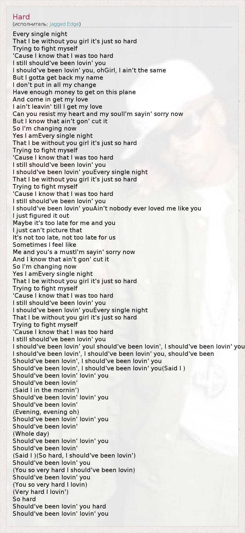 Every single night That I be without you girl it's just so hard Trying to fight myself 'Cause I know that I was too hard I still should've been lovin' you I should've been lovin' you, ohGirl, I ain't the same But I gotta get back my name I don't put in all my change Have enough money to get on this plane And come in get my love I ain't leavin' till I get my love Can you resist my heart and my soulI'm sayin' sorry now But I know that ain't gon' cut it So I'm changing now Yes I amEvery single night That I be without you girl it's just so hard Trying to fight myself 'Cause I know that I was too hard I still should've been lovin' you I should've been lovin' youEvery single night That I be without you girl it's just so hard Trying to fight myself 'Cause I know that I was too hard I still should've been lovin' you I should've been lovin' youAin't nobody ever loved me like you I just figured it out Maybe it's too late for me and you I just can't picture that It's not too late, not too late for us Sometimes I feel like Me and you's a mustI'm sayin' sorry now And I know that ain't gon' cut it So I'm changing now Yes I amEvery single night That I be without you girl it's just so hard Trying to fight myself 'Cause I know that I was too hard I still should've been lovin' you I should've been lovin' youEvery single night That I be without you girl it's just so hard Trying to fight myself 'Cause I know that I was too hard I still should've been lovin' you I should've been lovin' youI should've been lovin', I should've been lovin' you I should've been lovin', I should've been lovin' you, should've been Should've been lovin', I should've been lovin' you Should've been lovin', I should've been lovin' you(Said I ) Should've been lovin' lovin' you Should've been lovin' (Said I in the mornin') Should've been lovin' lovin' you Should've been lovin' (Evening, evening oh) Should've been lovin' lovin' you Should've been lovin' (Whole day) Should've been lovin' lovin' you Should've been lovin' (Said I )(So hard, I should've been lovin') Should've been lovin' you (You so very hard I should've been lovin) Should've been lovin' you (You so very hard I lovin) (Very hard I lovin') So hard Should've been lovin' you hard Should've been lovin' lovin' you