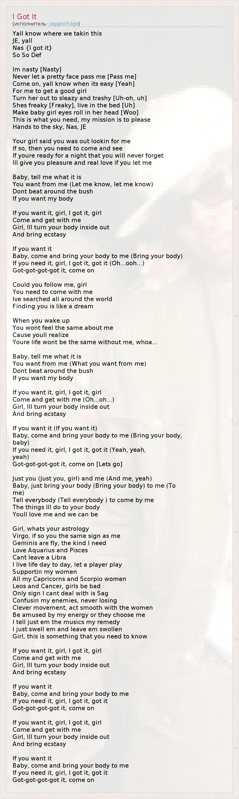Это интересно:Jagged Edge - американская R&B певческая группа, которая первоначально подписалась через Со Со Деф Рекордс Джермана Дюпри на Коламбиа Рекордс. Группа состоит из близнецов - лидирующих певцов Брайана Кеси (прозванного Браско) и Брендона Кеси (Кейса Динеро) (оба рождены 13 октября 1978), Кайла Нормана (Куик), и Ричарда Уинго (Уинго). Уинго позже присоединился к группе после того как Канди Баррусс... продолжение