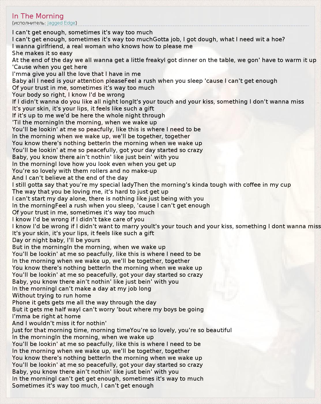 I can't get enough, sometimes it's way too much I can't get enough, sometimes it's way too muchGotta job, I got dough, what I need wit a hoe? I wanna girlfriend, a real woman who knows how to please me She makes it so easy At the end of the day we all wanna get a little freakyI got dinner on the table, we gon' have to warm it up 'Cause when you get here I'mma give you all the love that I have in me Baby all I need is your attention pleaseFeel a rush when you sleep 'cause I can't get enough Of your trust in me, sometimes it's way too much Your body so right, I know I'd be wrong If I didn't wanna do you like all night longIt's your touch and your kiss, something I don't wanna miss It's your skin, it's your lips, it feels like such a gift If it's up to me we'd be here the whole night through 'Til the morningIn the morning, when we wake up You'll be lookin' at me so peacfully, like this is where I need to be In the morning when we wake up, we'll be together, together You know there's nothing betterIn the morning when we wake up You'll be lookin' at me so peacefully, got your day started so crazy Baby, you know there ain't nothin' like just bein' with you In the morningI love how you look even when you get up You're so lovely with them rollers and no make-up And I can't believe at the end of the day I still gotta say that you're my special ladyThen the morning's kinda tough with coffee in my cup The way that you be loving me, it's hard to just get up I can't start my day alone, there is nothing like just being with you In the morningFeel a rush when you sleep, 'cause I can't get enough Of your trust in me, sometimes it's way too much I know I'd be wrong if I didn't take care of you I know I'd be wrong if I didn't want to marry youIt's your touch and your kiss, something I dont wanna miss It's your skin, it's your lips, it feels like such a gift Day or night baby, I'll be yours But in the morningIn the morning, when we wake up You'll be lookin' at me so peacfully, like this is where I need to be In the morning when we wake up, we'll be together, together You know there's nothing betterIn the morning when we wake up You'll be lookin' at me so peacefully, got your day started so crazy Baby, you know there ain't nothin' like just bein' with you In the morningI can't make a day at my job long Without trying to run home Phone it gets gets me all the way through the day But it gets me half wayI can't worry 'bout where my boys be going I'mma be right at home And I wouldn't miss it for nothin' Just for that morning time, morning timeYou're so lovely, you're so beautiful In the morningIn the morning, when we wake up You'll be lookin' at me so peacfully, like this is where I need to be In the morning when we wake up, we'll be together, together You know there's nothing betterIn the morning when we wake up You'll be lookin' at me so peacefully, got your day started so crazy Baby, you know there ain't nothin' like just bein' with you In the morningI can't get get enough, sometimes it's way to much Sometimes it's way too much, I can't get enough