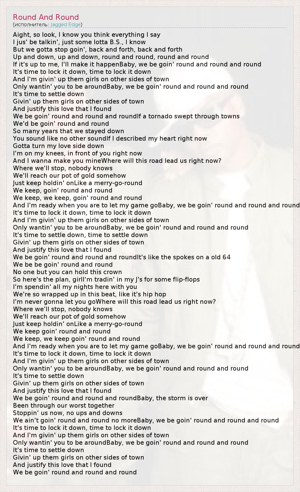 We ain't goin' round and round no moreBaby, we be goin' round and round and round