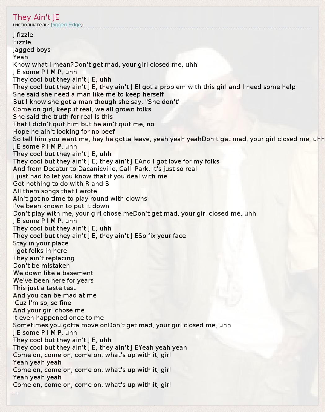 J fizzle Fizzle Jagged boys Yeah Know what I mean?Don't get mad, your girl closed me, uhh J E some P I M P, uhh They cool but they ain't J E, uhh They cool but they ain't J E, they ain't J EI got a problem with this girl and I need some help She said she need a man like me to keep herself But I know she got a man though she say, "She don't" Come on girl, keep it real, we all grown folks She said the truth for real is this That I didn't quit him but he ain't quit me, no Hope he ain't looking for no beef So tell him you want me, hey he gotta leave, yeah yeah yeahDon't get mad, your girl closed me, uhh J E some P I M P, uhh They cool but they ain't J E, uhh They cool but they ain't J E, they ain't J EAnd I got love for my folks And from Decatur to Dacanicville, Calli Park, it's just so real I just had to let you know that if you deal with me Got nothing to do with R and B All them songs that I wrote Ain't got no time to play round with clowns I've been known to put it down Don't play with me, your girl chose meDon't get mad, your girl closed me, uhh J E some P I M P, uhh They cool but they ain't J E, uhh They cool but they ain't J E, they ain't J ESo fix your face Stay in your place I got folks in here They ain't replacing Don't be mistaken We down like a basement We've been here for years This just a taste test And you can be mad at me 'Cuz I'm so, so fine And your girl chose me It even happened once to me Sometimes you gotta move onDon't get mad, your girl closed me, uhh J E some P I M P, uhh They cool but they ain't J E, uhh They cool but they ain't J E, they ain't J EYeah yeah yeah Come on, come on, come on, what's up with it, girl Yeah yeah yeah Come on, come on, come on, what's up with it, girl Yeah yeah yeah Come on, come on, come on, what's up with it, girl ...