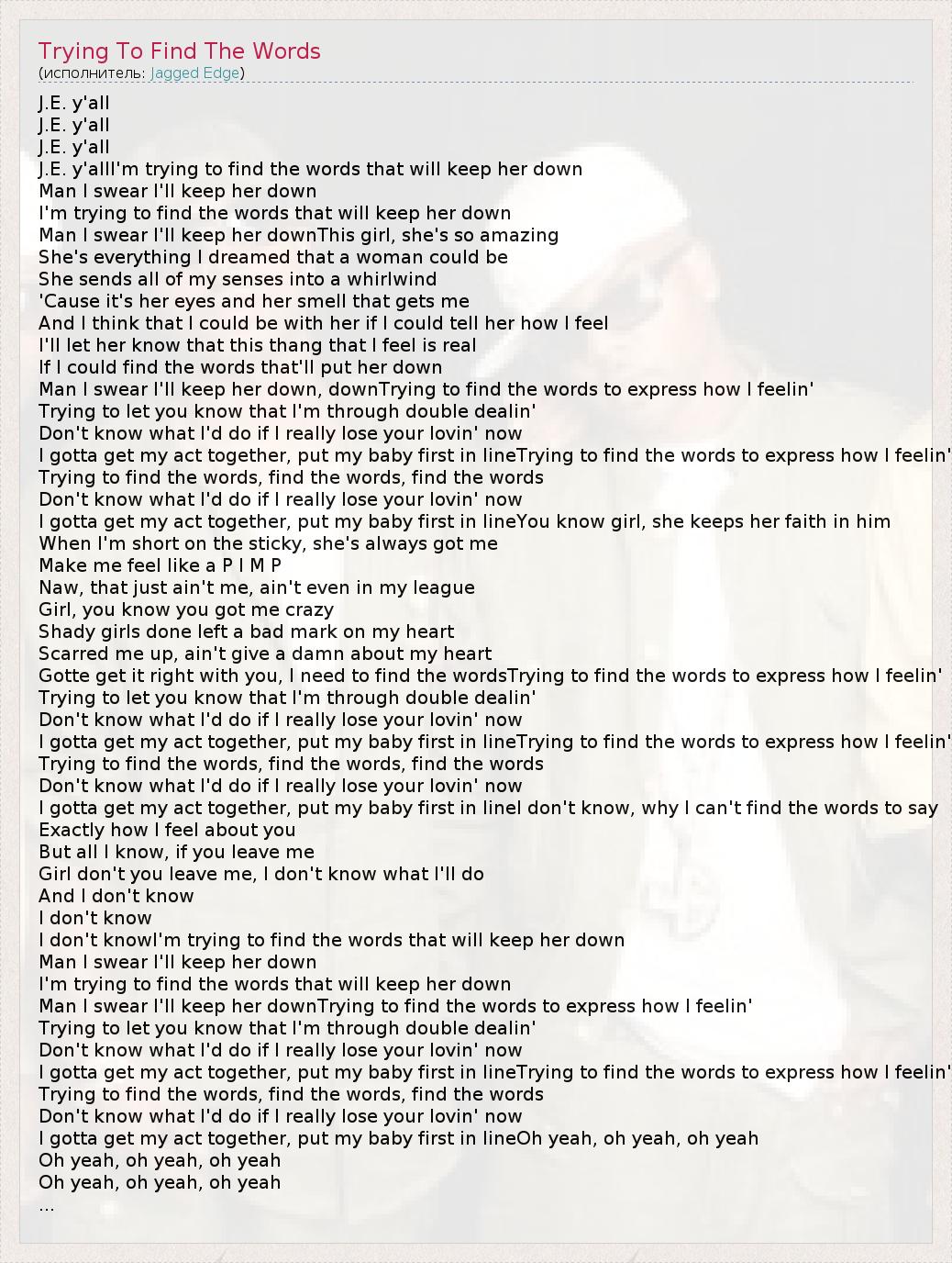 J.E. y'all J.E. y'all J.E. y'all J.E. y'allI'm trying to find the words that will keep her down Man I swear I'll keep her down I'm trying to find the words that will keep her down Man I swear I'll keep her downThis girl, she's so amazing She's everything I dreamed that a woman could be She sends all of my senses into a whirlwind 'Cause it's her eyes and her smell that gets me And I think that I could be with her if I could tell her how I feel I'll let her know that this thang that I feel is real If I could find the words that'll put her down Man I swear I'll keep her down, downTrying to find the words to express how I feelin' Trying to let you know that I'm through double dealin' Don't know what I'd do if I really lose your lovin' now I gotta get my act together, put my baby first in lineTrying to find the words to express how I feelin' Trying to find the words, find the words, find the words Don't know what I'd do if I really lose your lovin' now I gotta get my act together, put my baby first in lineYou know girl, she keeps her faith in him When I'm short on the sticky, she's always got me Make me feel like a P I M P Naw, that just ain't me, ain't even in my league Girl, you know you got me crazy Shady girls done left a bad mark on my heart Scarred me up, ain't give a damn about my heart Gotte get it right with you, I need to find the wordsTrying to find the words to express how I feelin' Trying to let you know that I'm through double dealin' Don't know what I'd do if I really lose your lovin' now I gotta get my act together, put my baby first in lineTrying to find the words to express how I feelin' Trying to find the words, find the words, find the words Don't know what I'd do if I really lose your lovin' now I gotta get my act together, put my baby first in lineI don't know, why I can't find the words to say Exactly how I feel about you But all I know, if you leave me Girl don't you leave me, I don't know what I'll do And I don't know I don't know I don't knowI'm trying to find the words that will keep her down Man I swear I'll keep her down I'm trying to find the words that will keep her down Man I swear I'll keep her downTrying to find the words to express how I feelin' Trying to let you know that I'm through double dealin' Don't know what I'd do if I really lose your lovin' now I gotta get my act together, put my baby first in lineTrying to find the words to express how I feelin' Trying to find the words, find the words, find the words Don't know what I'd do if I really lose your lovin' now I gotta get my act together, put my baby first in lineOh yeah, oh yeah, oh yeah Oh yeah, oh yeah, oh yeah Oh yeah, oh yeah, oh yeah ...