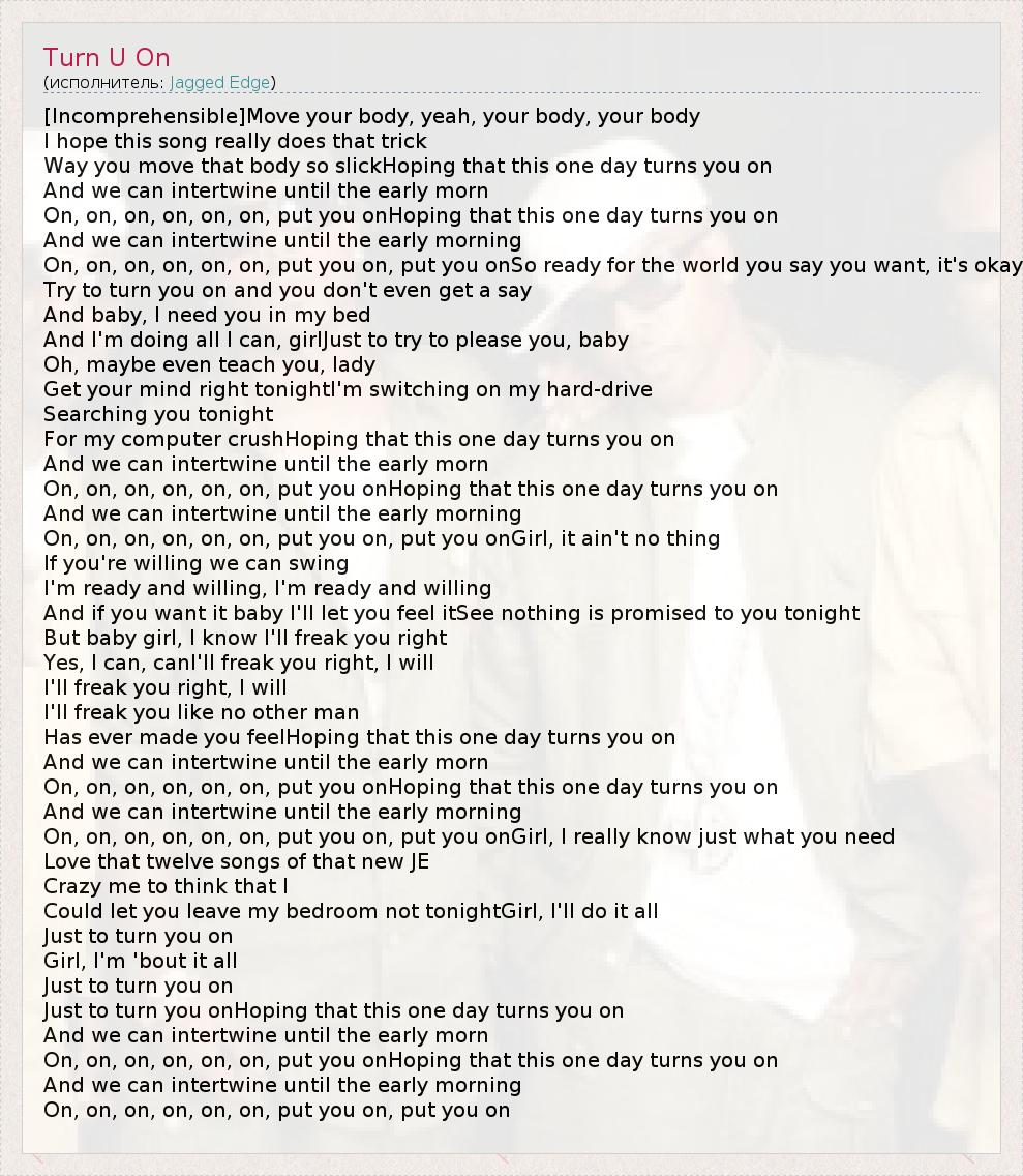 [Incomprehensible]Move your body, yeah, your body, your body I hope this song really does that trick Way you move that body so slickHoping that this one day turns you on And we can intertwine until the early morn On, on, on, on, on, on, put you onHoping that this one day turns you on And we can intertwine until the early morning On, on, on, on, on, on, put you on, put you onSo ready for the world you say you want, it's okay Try to turn you on and you don't even get a say And baby, I need you in my bed And I'm doing all I can, girlJust to try to please you, baby Oh, maybe even teach you, lady Get your mind right tonightI'm switching on my hard-drive Searching you tonight For my computer crushHoping that this one day turns you on And we can intertwine until the early morn On, on, on, on, on, on, put you onHoping that this one day turns you on And we can intertwine until the early morning On, on, on, on, on, on, put you on, put you onGirl, it ain't no thing If you're willing we can swing I'm ready and willing, I'm ready and willing And if you want it baby I'll let you feel itSee nothing is promised to you tonight But baby girl, I know I'll freak you right Yes, I can, canI'll freak you right, I will I'll freak you right, I will I'll freak you like no other man Has ever made you feelHoping that this one day turns you on And we can intertwine until the early morn On, on, on, on, on, on, put you onHoping that this one day turns you on And we can intertwine until the early morning On, on, on, on, on, on, put you on, put you onGirl, I really know just what you need Love that twelve songs of that new JE Crazy me to think that I Could let you leave my bedroom not tonightGirl, I'll do it all Just to turn you on Girl, I'm 'bout it all Just to turn you on Just to turn you onHoping that this one day turns you on And we can intertwine until the early morn On, on, on, on, on, on, put you onHoping that this one day turns you on And we can intertwine until the early morning On, on, on, on, on, on, put you on, put you on