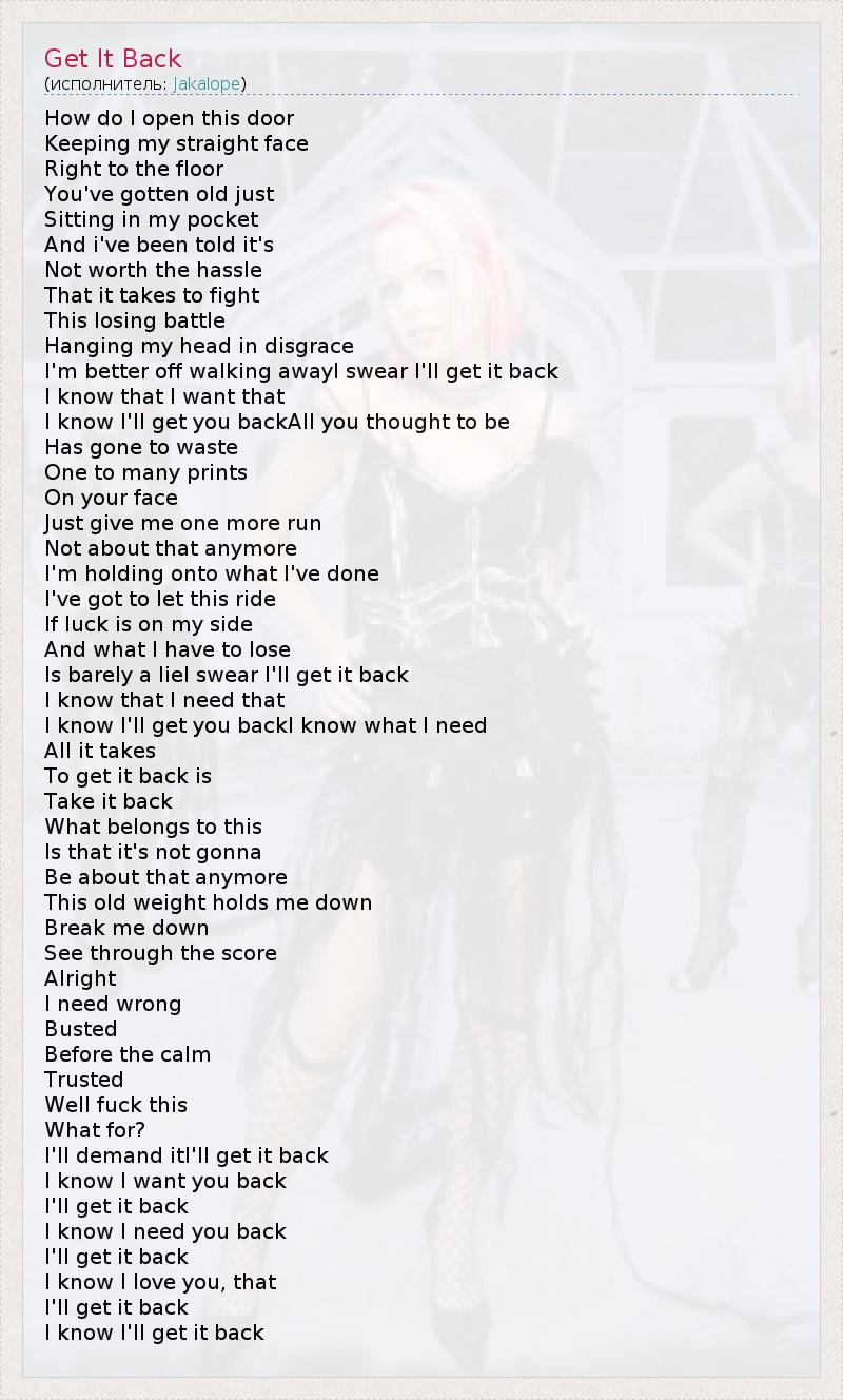 How do I open this door Keeping my straight face Right to the floor You've gotten old just Sitting in my pocket And i've been told it's Not worth the hassle That it takes to fight This losing battle Hanging my head in disgrace I'm better off walking awayI swear I'll get it back I know that I want that I know I'll get you backAll you thought to be Has gone to waste One to many prints On your face Just give me one more run Not about that anymore I'm holding onto what I've done I've got to let this ride If luck is on my side And what I have to lose Is barely a lieI swear I'll get it back I know that I need that I know I'll get you backI know what I need All it takes To get it back is Take it back What belongs to this Is that it's not gonna Be about that anymore This old weight holds me down Break me down See through the score Alright I need wrong Busted Before the calm Trusted Well fuck this What for? I'll demand itI'll get it back I know I want you back I'll get it back I know I need you back I'll get it back I know I love you, that I'll get it back I know I'll get it back