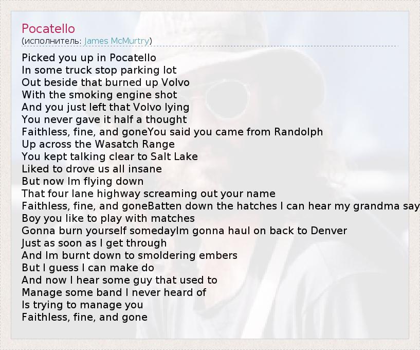 Это интересно:James McMurtry (born March 18, 1962 in Fort Worth, Texas) is a Texas rock and Americana music singer, songwriter, guitarist, bandleader and occasional actor (Daisy Miller, Lonesome Dove). He performs with veteran bandmates and rhythm section The Heartless Bastards (Darren Hess and Ronnie Johnson - Not to be confused with the Cincinnati, OH, band of the same name).His father, novelist Larry McMurtry, gave him his first guitar at age seven. His mother, an English professor, taught him how to play it: "My mother taught me three chords and the rest I just stole as I went along. I learned everything by ear or by watching people."Contents 1 Biography 2 Discography... продолжение