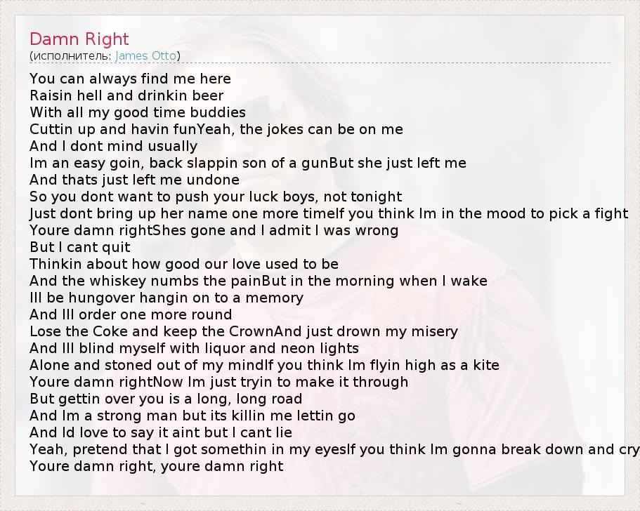 You can always find me here Raisin hell and drinkin beer With all my good time buddies Cuttin up and havin funYeah, the jokes can be on me And I dont mind usually Im an easy goin, back slappin son of a gunBut she just left me And thats just left me undone So you dont want to push your luck boys, not tonight Just dont bring up her name one more timeIf you think Im in the mood to pick a fight Youre damn rightShes gone and I admit I was wrong But I cant quit Thinkin about how good our love used to be And the whiskey numbs the painBut in the morning when I wake Ill be hungover hangin on to a memory And Ill order one more round Lose the Coke and keep the CrownAnd just drown my misery And Ill blind myself with liquor and neon lights Alone and stoned out of my mindIf you think Im flyin high as a kite Youre damn rightNow Im just tryin to make it through But gettin over you is a long, long road And Im a strong man but its killin me lettin go And Id love to say it aint but I cant lie Yeah, pretend that I got somethin in my eyesIf you think Im gonna break down and cry Youre damn right, youre damn right