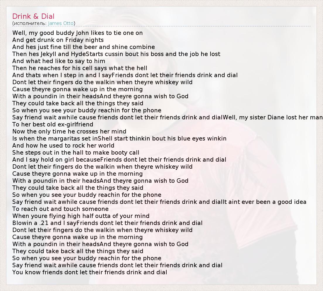 Well, my good buddy John likes to tie one on And get drunk on Friday nights And hes just fine till the beer and shine combine Then hes Jekyll and HydeStarts cussin bout his boss and the job he lost And what hed like to say to him Then he reaches for his cell says what the hell And thats when I step in and I sayFriends dont let their friends drink and dial Dont let their fingers do the walkin when theyre whiskey wild Cause theyre gonna wake up in the morning With a poundin in their headsAnd theyre gonna wish to God They could take back all the things they said So when you see your buddy reachin for the phone Say friend wait awhile cause friends dont let their friends drink and dialWell, my sister Diane lost her man To her best old ex-girlfriend Now the only time he crosses her mind Is when the margaritas set inShell start thinkin bout his blue eyes winkin And how he used to rock her world She steps out in the hall to make booty call And I say hold on girl becauseFriends dont let their friends drink and dial Dont let their fingers do the walkin when theyre whiskey wild Cause theyre gonna wake up in the morning With a poundin in their headsAnd theyre gonna wish to God They could take back all the things they said So when you see your buddy reachin for the phone Say friend wait awhile cause friends dont let their friends drink and dialIt aint ever been a good idea To reach out and touch someone When youre flying high half outta of your mind Blowin a .21 and I sayFriends dont let their friends drink and dial Dont let their fingers do the walkin when theyre whiskey wild Cause theyre gonna wake up in the morning With a poundin in their headsAnd theyre gonna wish to God They could take back all the things they said So when you see your buddy reachin for the phone Say friend wait awhile cause friends dont let their friends drink and dial You know friends dont let their friends drink and dial