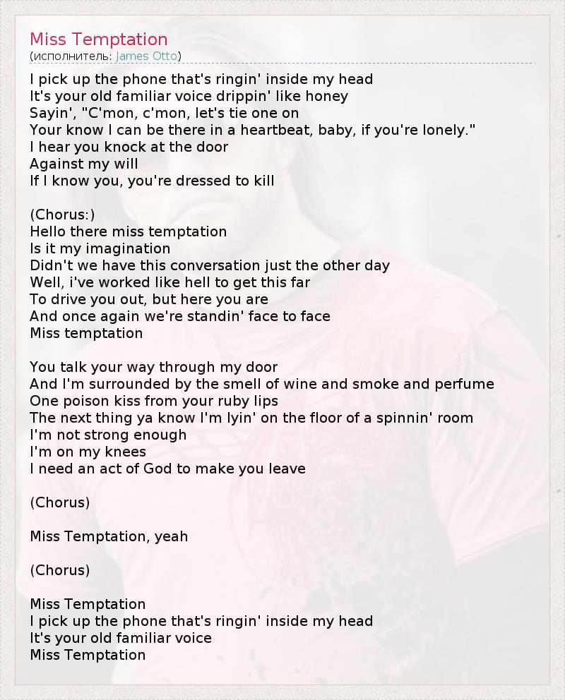 I pick up the phone that's ringin' inside my head It's your old familiar voice drippin' like honey Sayin', "C'mon, c'mon, let's tie one on Your know I can be there in a heartbeat, baby, if you're lonely." I hear you knock at the door Against my will If I know you, you're dressed to kill (Chorus:) Hello there miss temptation Is it my imagination Didn't we have this conversation just the other day Well, i've worked like hell to get this far To drive you out, but here you are And once again we're standin' face to face Miss temptation You talk your way through my door And I'm surrounded by the smell of wine and smoke and perfume One poison kiss from your ruby lips The next thing ya know I'm lyin' on the floor of a spinnin' room I'm not strong enough I'm on my knees I need an act of God to make you leave (Chorus) Miss Temptation, yeah (Chorus) Miss Temptation I pick up the phone that's ringin' inside my head It's your old familiar voice Miss Temptation