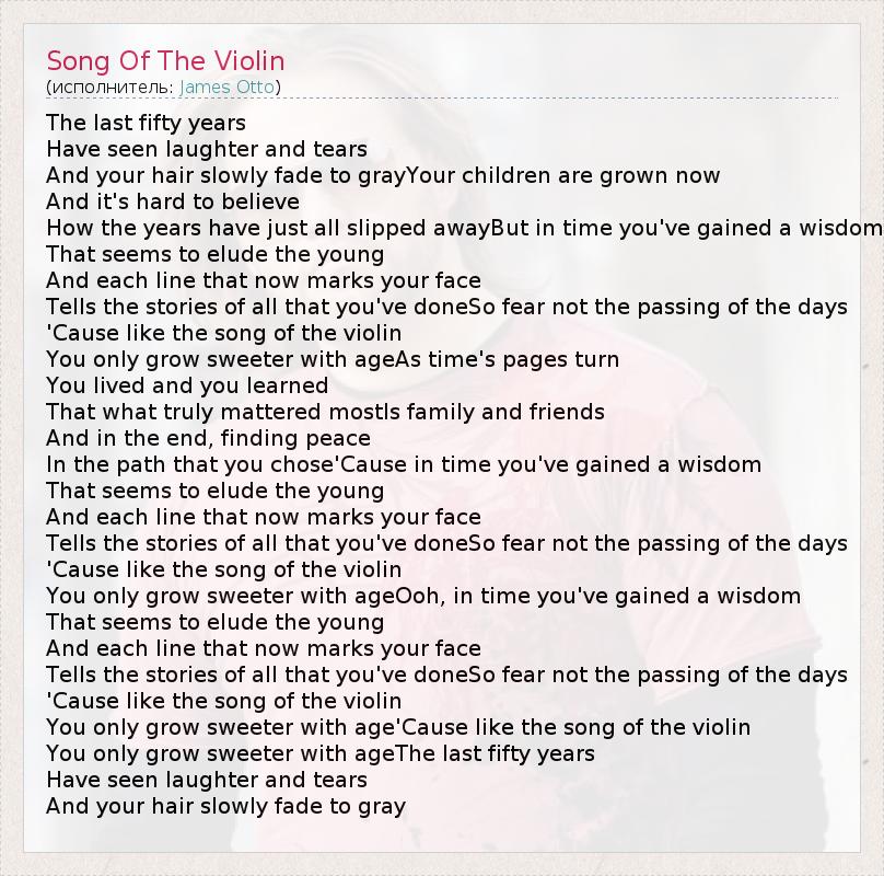 The last fifty years Have seen laughter and tears And your hair slowly fade to grayYour children are grown now And it's hard to believe How the years have just all slipped awayBut in time you've gained a wisdom That seems to elude the young And each line that now marks your face Tells the stories of all that you've doneSo fear not the passing of the days 'Cause like the song of the violin You only grow sweeter with ageAs time's pages turn You lived and you learned That what truly mattered mostIs family and friends And in the end, finding peace In the path that you chose'Cause in time you've gained a wisdom That seems to elude the young And each line that now marks your face Tells the stories of all that you've doneSo fear not the passing of the days 'Cause like the song of the violin You only grow sweeter with ageOoh, in time you've gained a wisdom That seems to elude the young And each line that now marks your face Tells the stories of all that you've doneSo fear not the passing of the days 'Cause like the song of the violin You only grow sweeter with age'Cause like the song of the violin You only grow sweeter with ageThe last fifty years Have seen laughter and tears And your hair slowly fade to gray